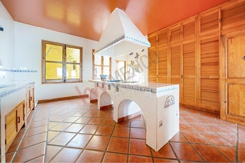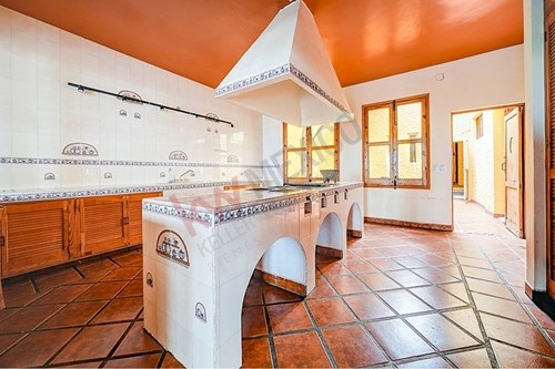Clay tile floors, hand-hewn wooden beams, and natural stone elements create a sense of grounded elegance. The spacious kitchen, adorned with hand-painted Talavera tile, is a place for connection and creation, where meals become memories.