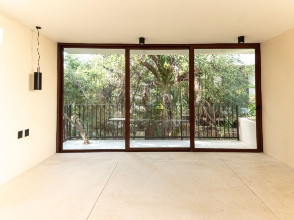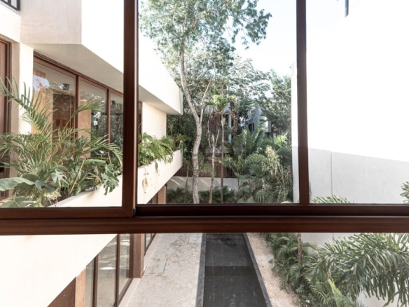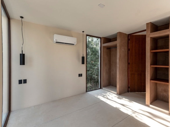 The open-concept living area seamlessly blends modern elegance with natural charm. A spacious kitchen island, premium travertine countertops, and effortless access to the private garden and pool make entertaining a delight. A lush oasis awaits outside, complete with a sparkling pool for cooling off under Tulum’s warm sun.