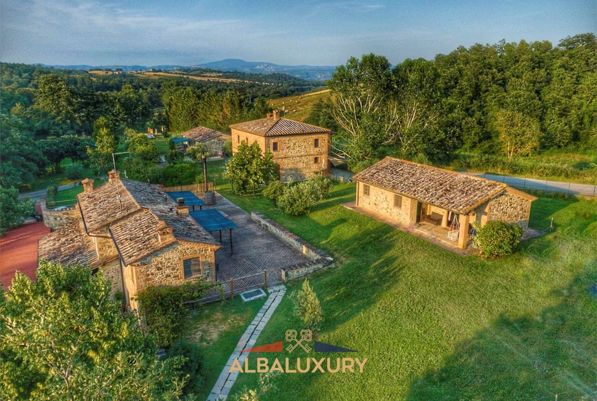 In the rolling hills between Umbria and Tuscany, a charming luxury property in the province of Perugia, skilfully restored and divided into 4 farmhouses, 9 hectares of land, swimming pool, restaurant and a polo field. Today the property is used for tourism but can also be used as a private residence. The total surface area of the 4 farmhouses is approx. 800 sqm divided into 9 flats divided between:^- Central farmhouse: with 3 renovated flats between the ground floor and the first floor of which a three-roomed flat of approx. 90 sqm with living room, open kitchen, study and two bedrooms (one double and one with two single beds) and two bathrooms – then on the first floor the two flats of approx. 50 sqm and 40 sqm with living room with fireplace, kitchenette, rooms and bathroom. ^- The other 3 farmhouses: are each divided with two flats and are about 40 square metres per apartment with living room, kitchenette, bedroom and bathroom.^- Restaurant with 60/70 seats internally + a summer patio with about 80 seats^- There is a swimming pool, measuring 7×16 metres. It concludes with land of about 9 hectares complete with olive trees, woodland and arable land. The panoramic position, on the top of a hill, makes the property particularly evocative; from the windows the view is lost on the Umbrian and Tuscan hills. Lovers of unspoilt nature can delight in walks and hikes along paths through the woods, the natural habitat of birds and wild animals. Sports enthusiasts can enjoy mountain biking, trekking, fording streams. In less than 20 minutes, you can reach interesting historical centres in Umbria and Tuscany: Orvieto, San Casciano dei bagni, Cetona, Cittu00e0 della Pieve, Montepulciano. The villages of the nearby Val D’Orcia are also of historical interest, while for a relaxing holiday, we recommend the nearby spa resorts of Chianciano, S. Albino and Bagno Vignoni.^,