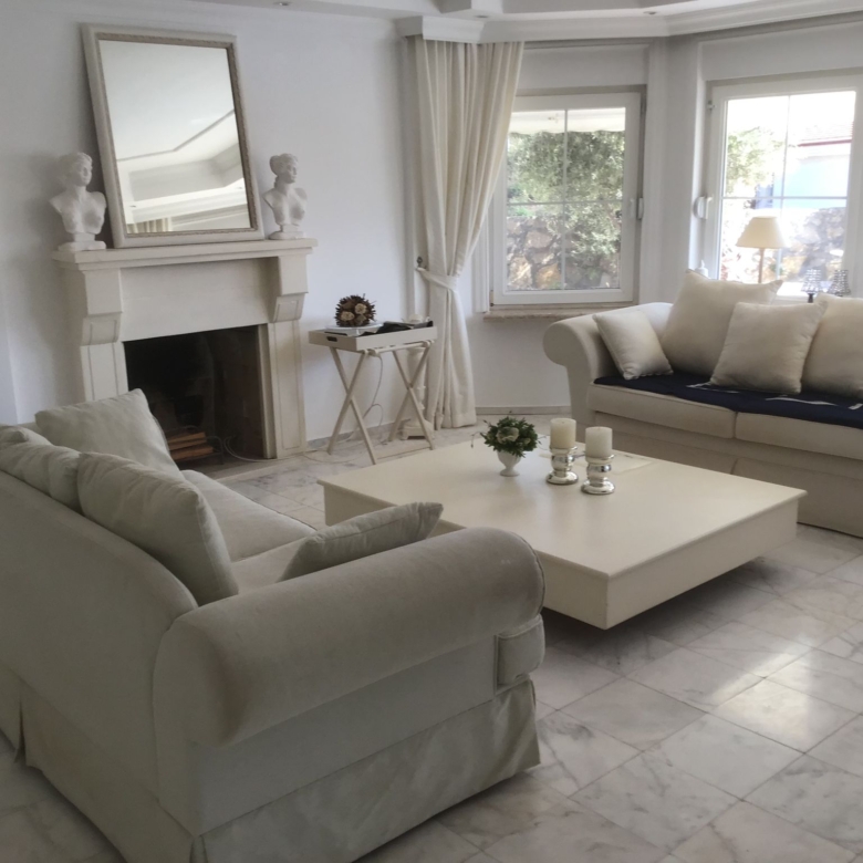 Inside, the home reflects the same elegance seen outside. It’s furnished with quality pieces and designed for comfort and visual harmony. The open-plan ground floor includes a spacious living room, a full kitchen, and dining space, all connected to the poolside terrace via large sliding glass doors.