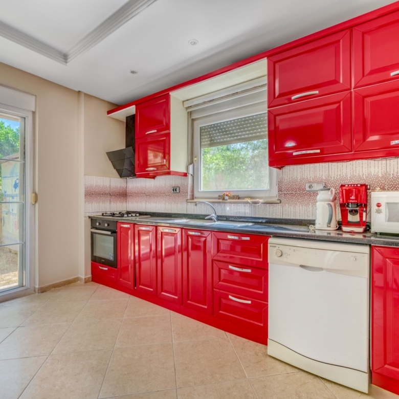 A bold highlight of the villa, the kitchen contrasts glossy red cabinetry with white units. It feels retro-modern, energetic, and eye-catching. For broader appeal, future owners may choose matte white or wood-tone replacements, which would calm the space and make it easier to pair with various furniture styles.