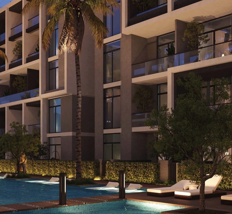 A contemporary low‑rise design (G+4) maximises pool views and cross‑ventilation. Studios, 1‑, 2‑ and 3‑bedroom layouts feature private terraces and open‑plan kitchens for modern indoor‑outdoor living. (See floor‑plan samples on pages 9‑10 of the brochure.)