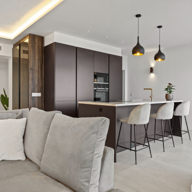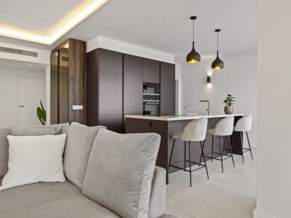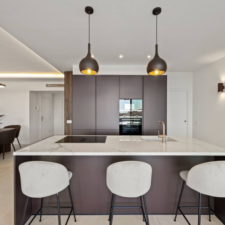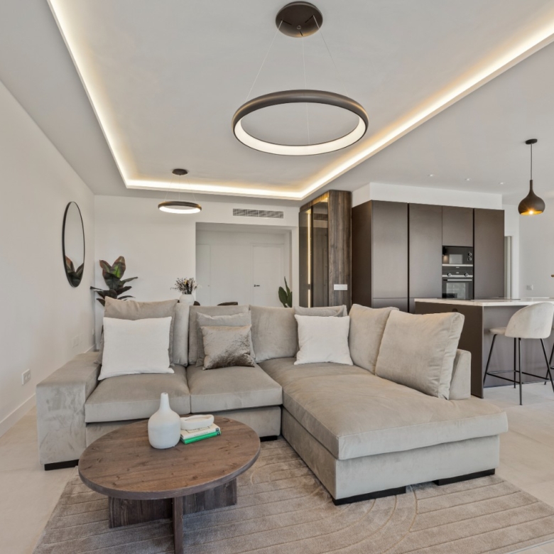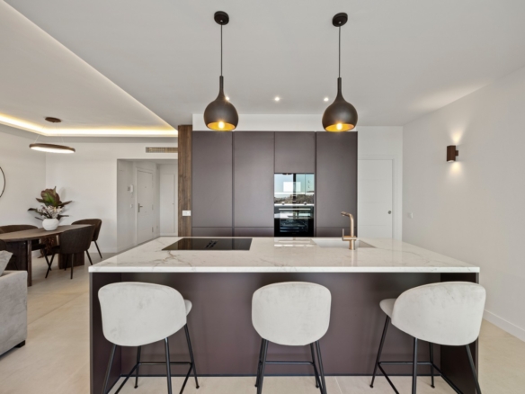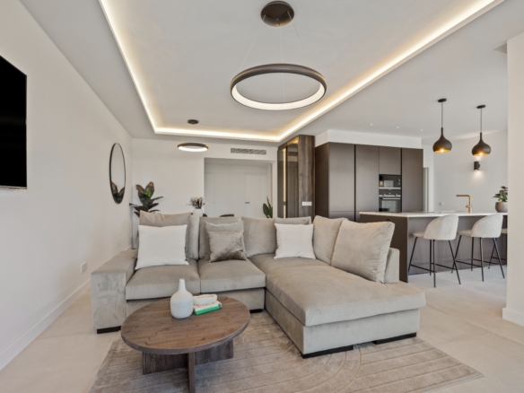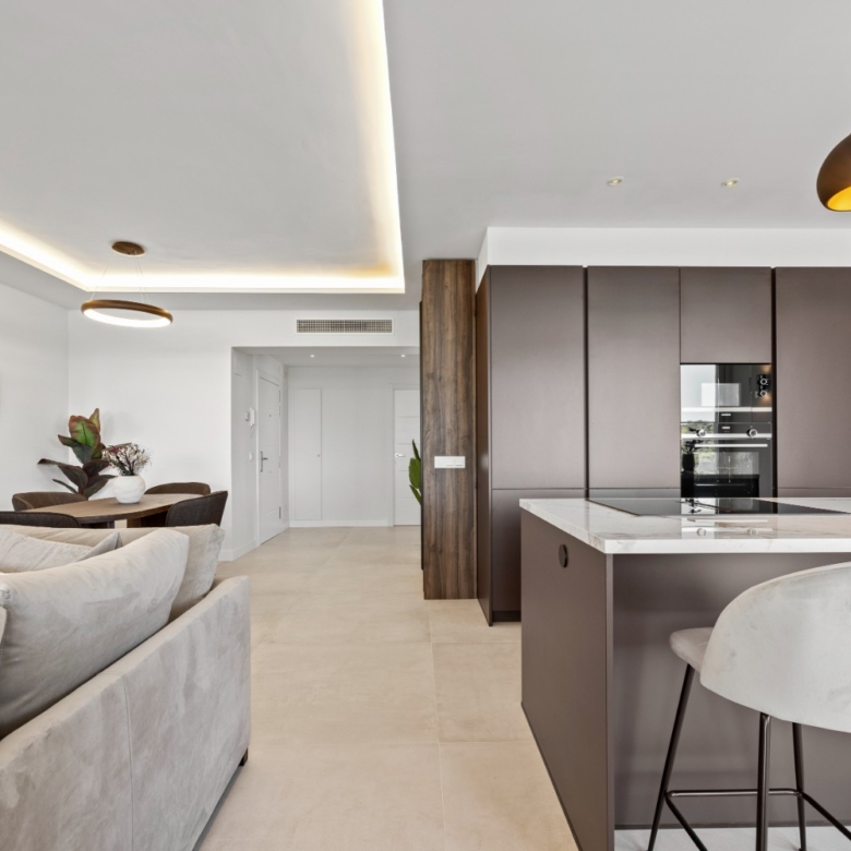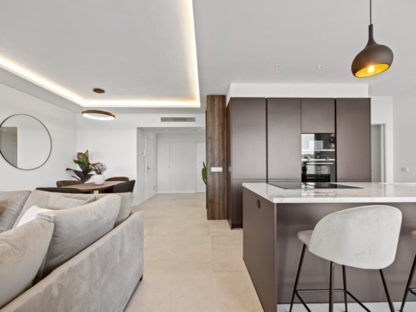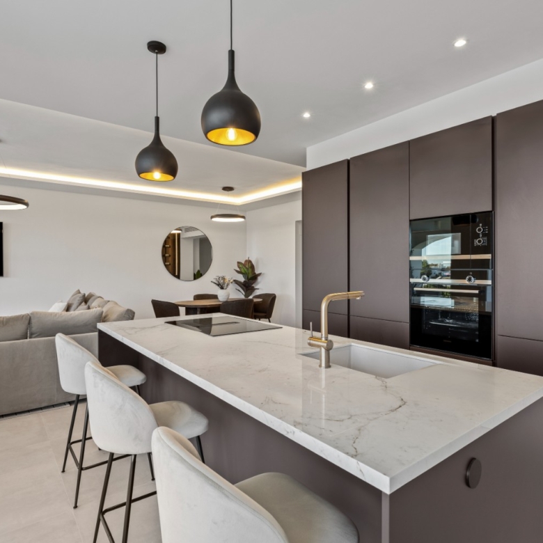 The sunlit open-plan living area seamlessly connects to an expansive terrace through floor-to-ceiling sliding glass doors, perfectly merging indoor and outdoor spaces. A sleek, modern kitchen — complete with a sophisticated marble island — creates an ideal setting for both relaxed everyday living and stylish entertaining, all while enjoying uninterrupted vistas.