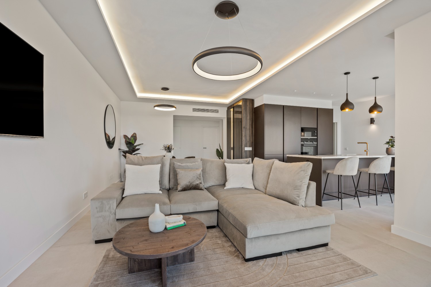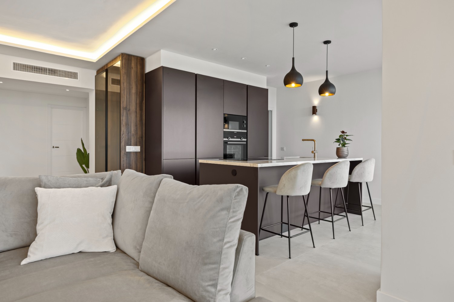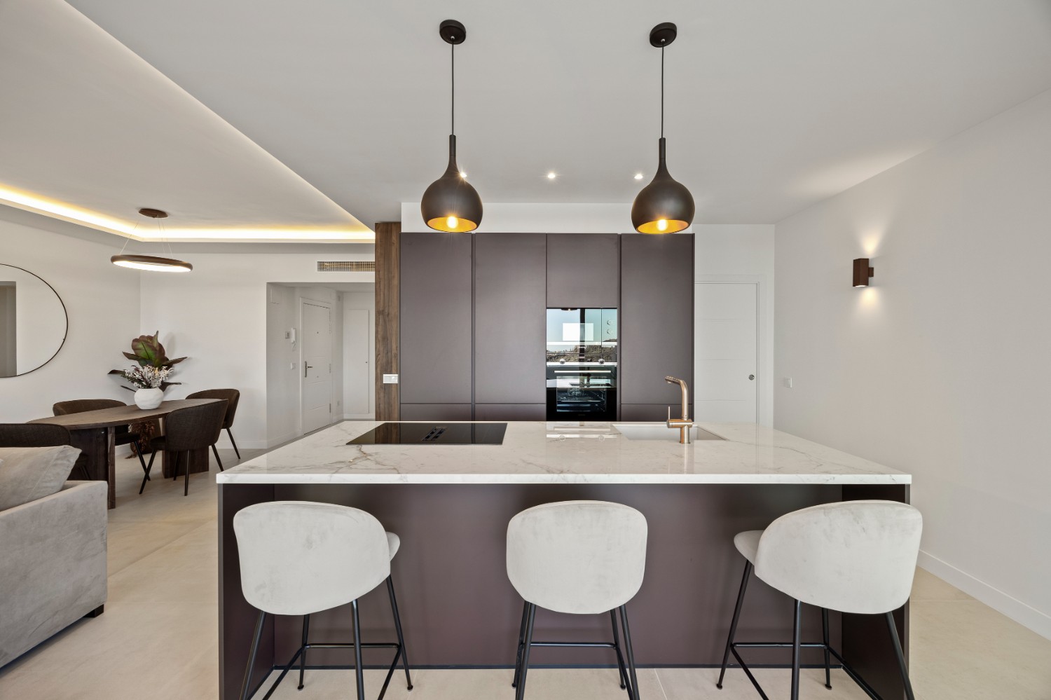 The sunlit open-plan living area seamlessly connects to an expansive terrace through floor-to-ceiling sliding glass doors, perfectly merging indoor and outdoor spaces. A sleek, modern kitchen — complete with a sophisticated marble island — creates an ideal setting for both relaxed everyday living and stylish entertaining, all while enjoying uninterrupted vistas.