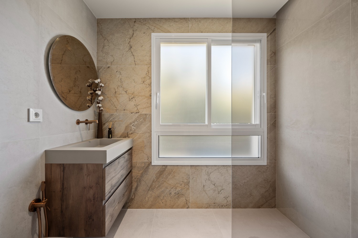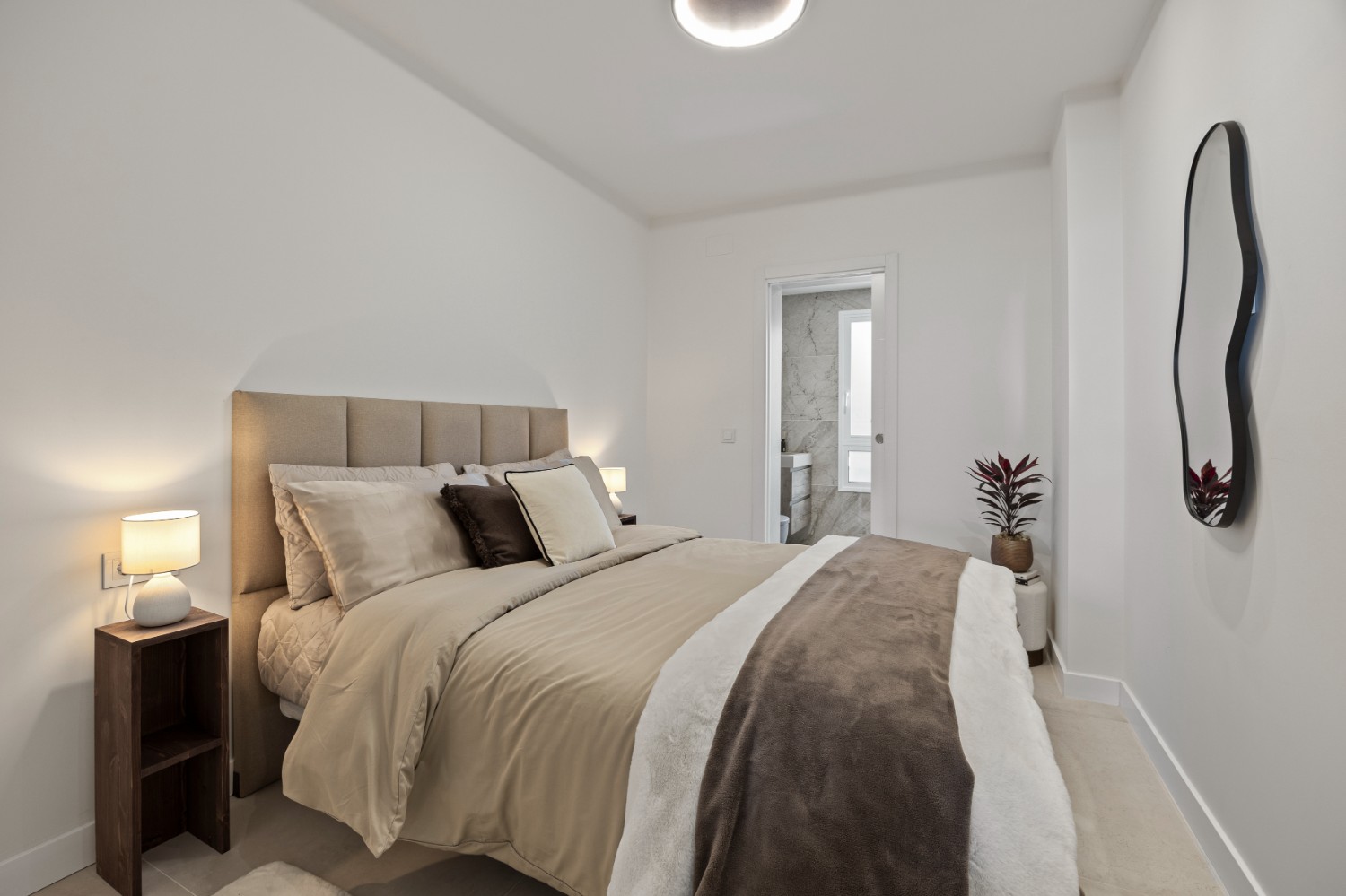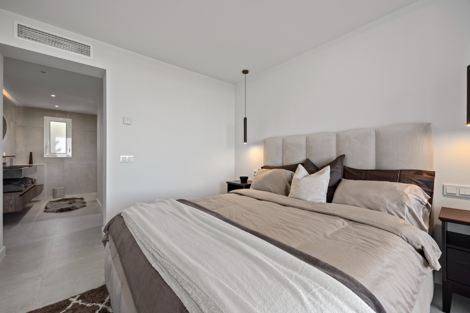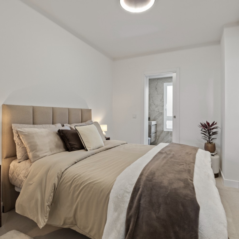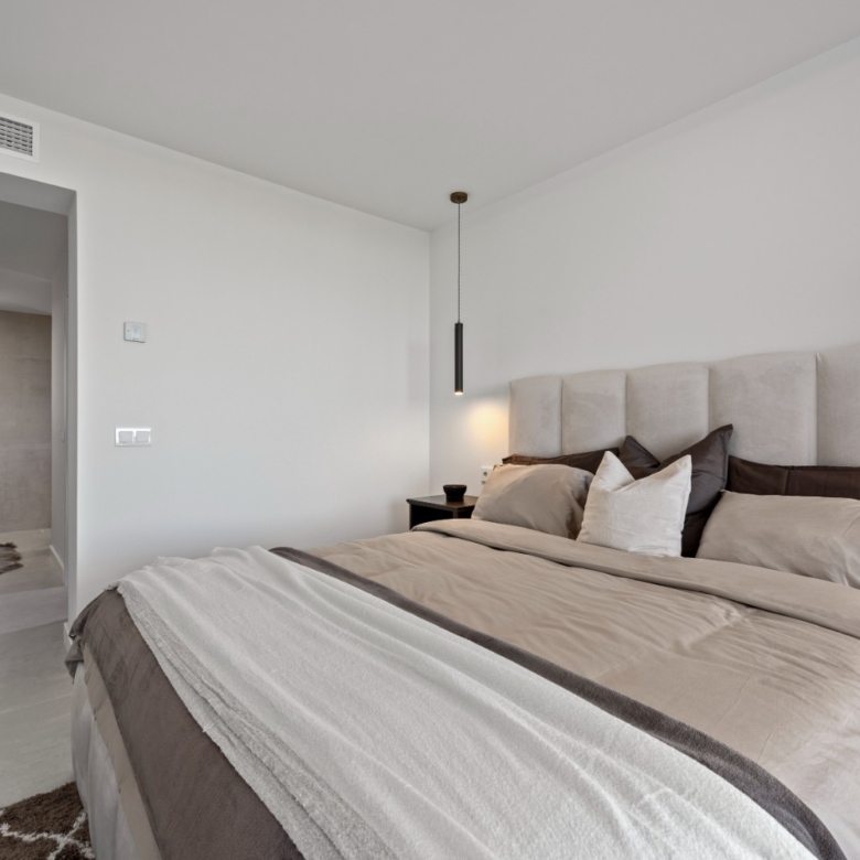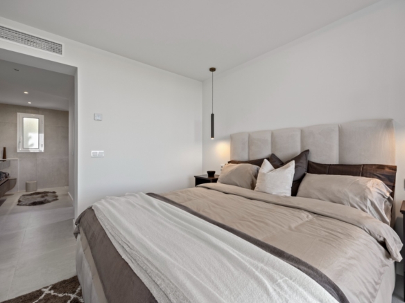 The master suite offers a private retreat, featuring a spacious walk-in wardrobe, a luxurious en-suite bathroom with both bathtub and walk-in shower, and direct access to the terrace. The second bedroom also benefits from a private en-suite, while the third bedroom is conveniently located beside a full guest bathroom with a walk-in shower.