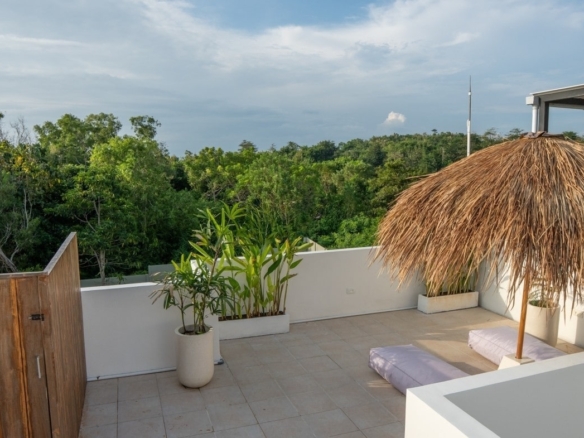 Occupying 166 sqm of land with an 80 sqm building, the villa features a smart 1.5-floor layout, including a rooftop lounge area overlooking lush greenery. The cozy closed living space flows into a practical kitchen and dining area, creating an inviting setting for everyday living. There are two well-designed bedrooms and two bathrooms, equipped with bathtubs, double sinks, and rain showers for added comfort.