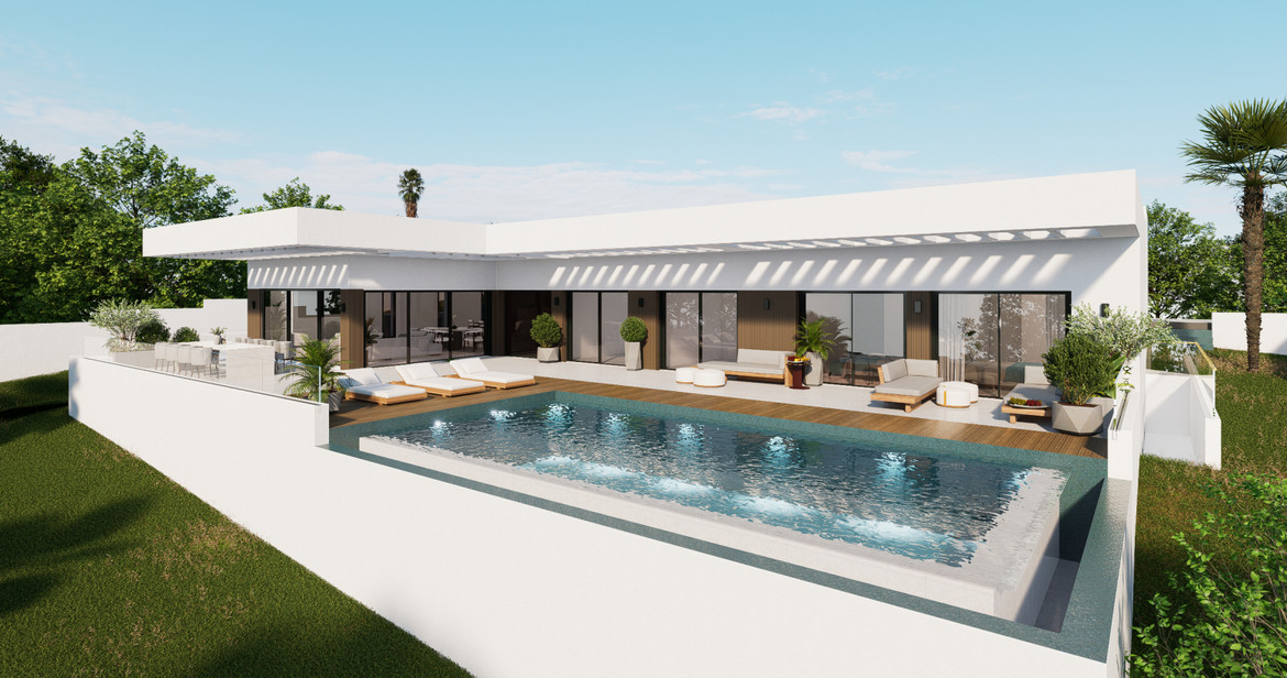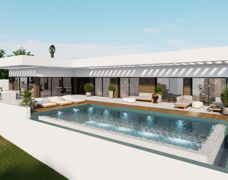 This modern and spacious villa is all on one level, with a built area of 200 m² plus a terrace and a large covered private parking area. The large energy-efficient windows allow you to enjoy the stunning views over the golf course and the surrounding area, while bathing all bedrooms and the open-plan living area in abundant natural light. The rooms lead directly out onto the terrace, where you can enjoy the landscaped garden and your private swimming pool.