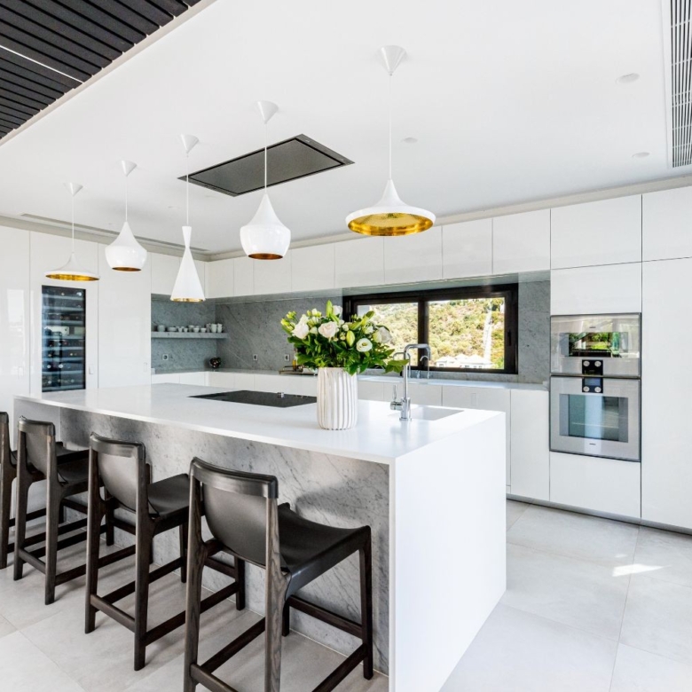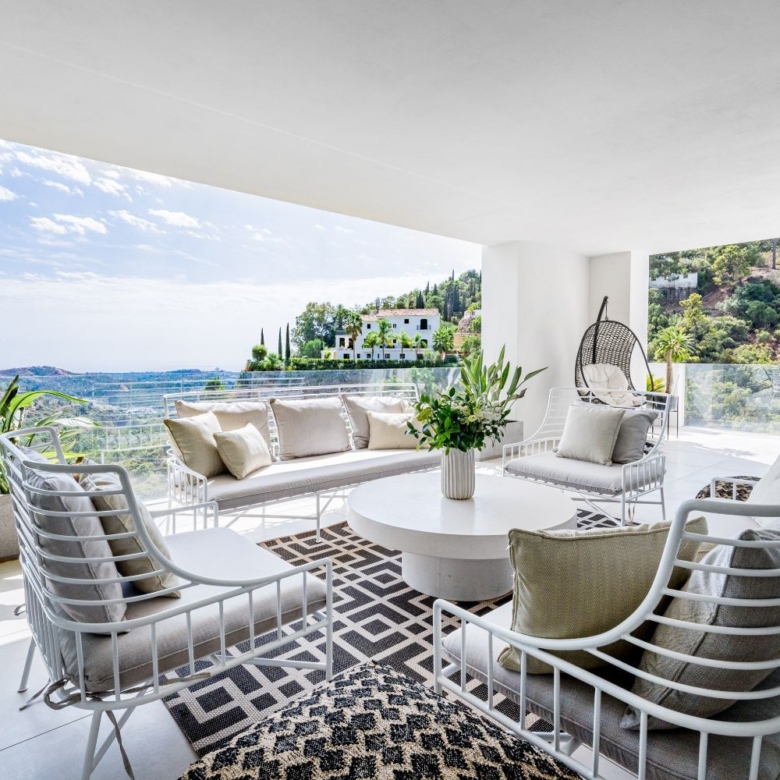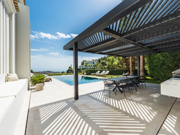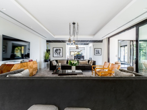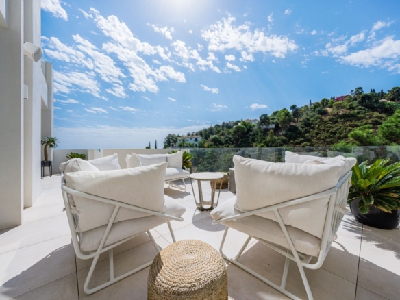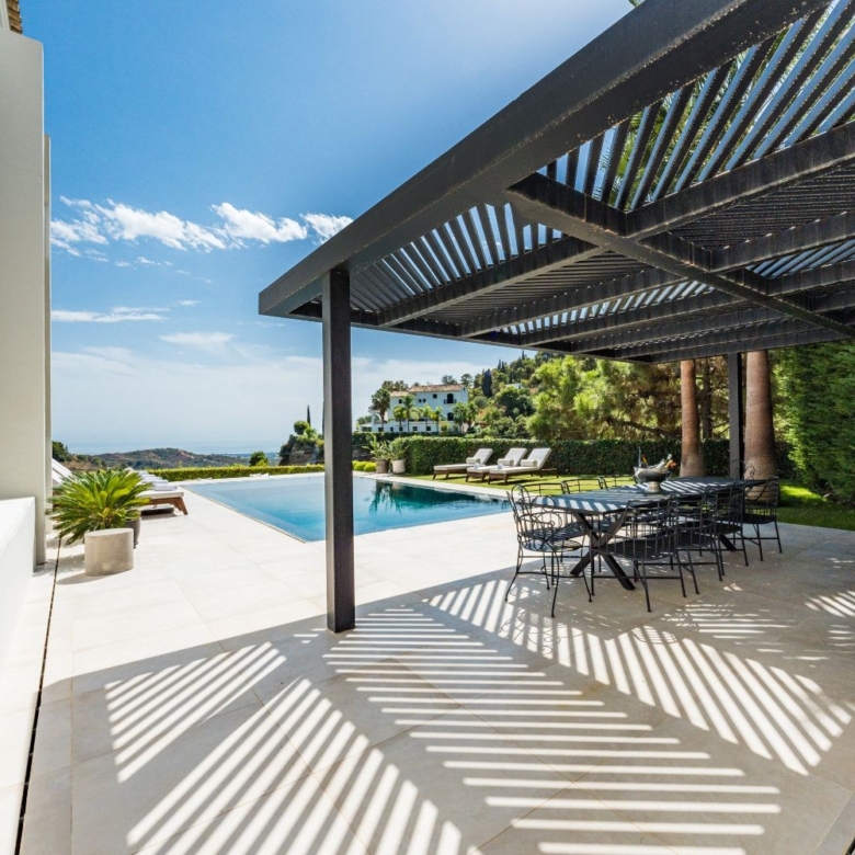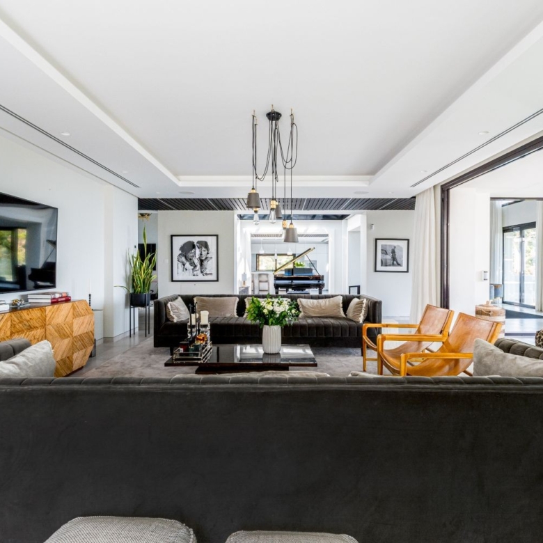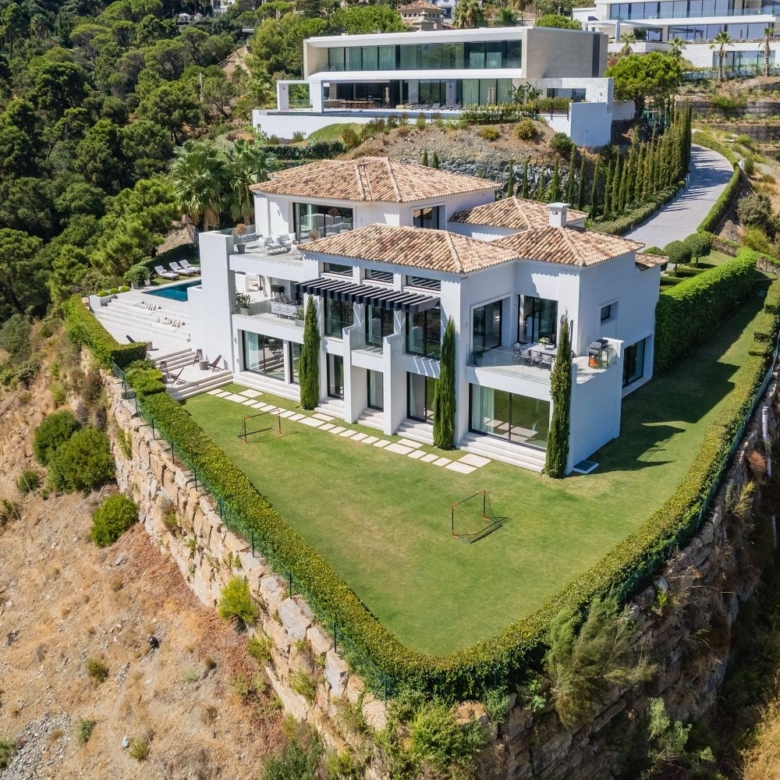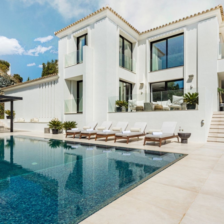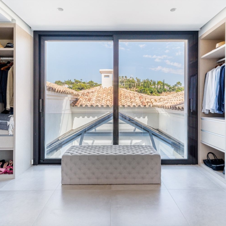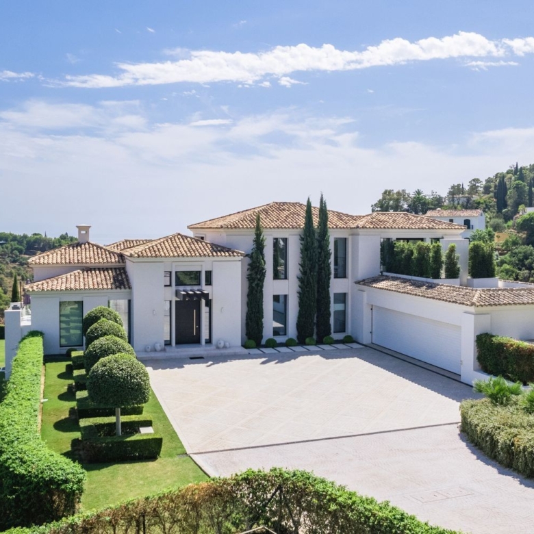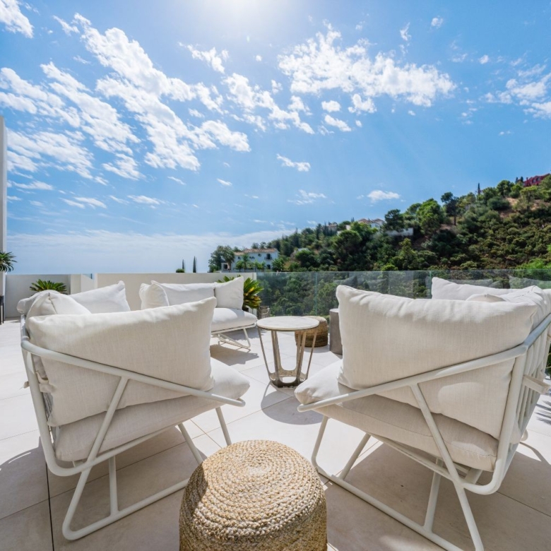 Spectacular house situated in the cozy hillside of El Madroñal. The house benefits from its elevated position and offers amazing sea views. The ground floor comprises of a big hall, two living rooms, a spectacular dining room and a beautiful contemporary kitchen. On the lower level, there are three good sized bedrooms, a gym, laundry room and spa.