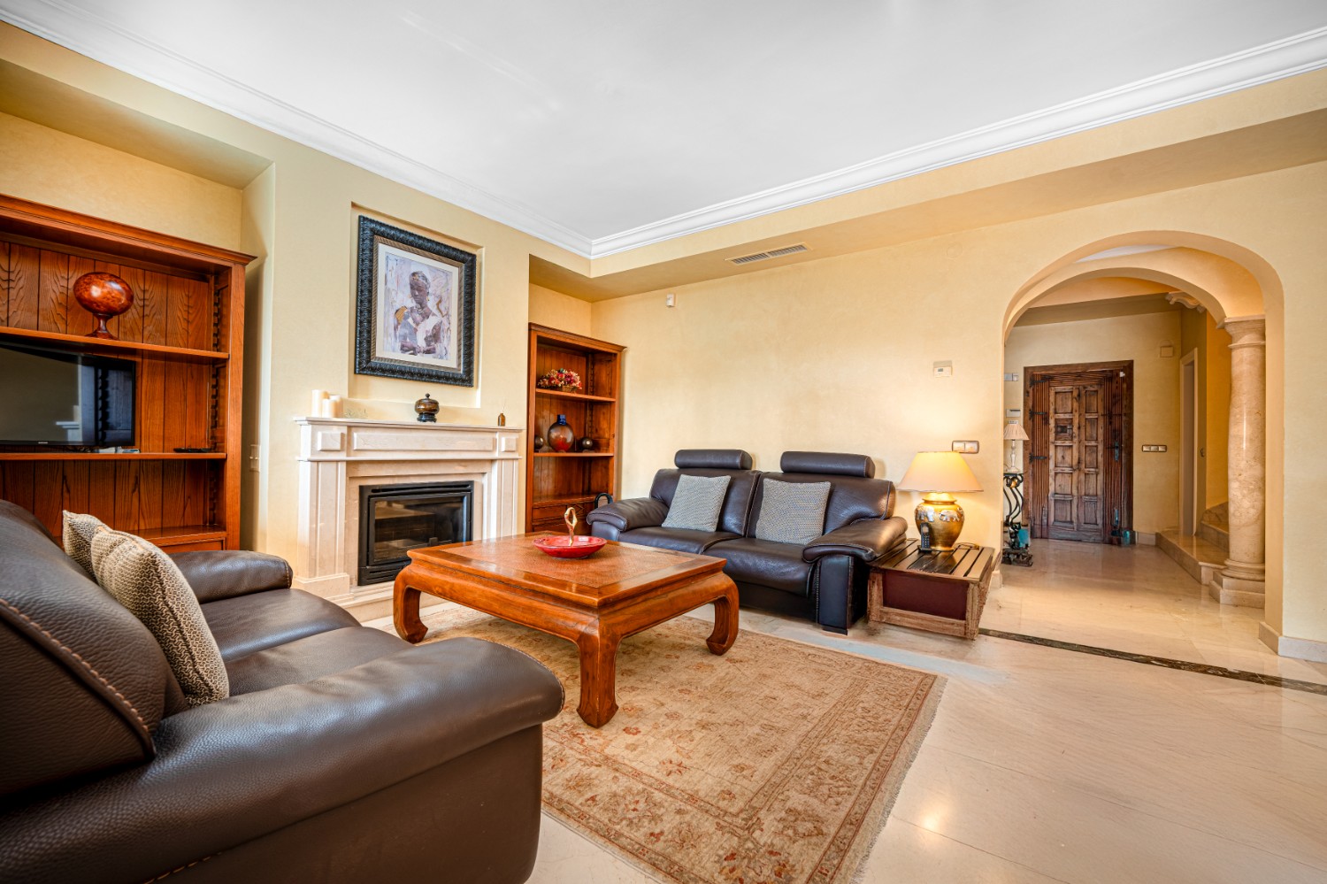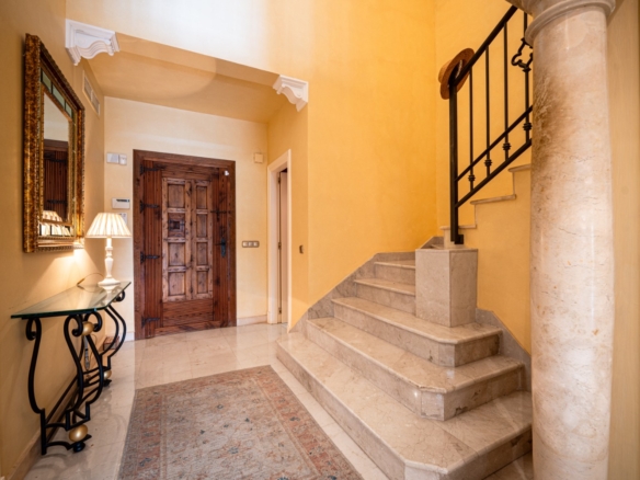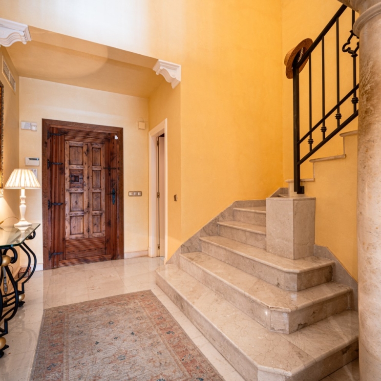 Set near the end of a quiet road, the home enjoys a private garden adjacent to beautifully landscaped communal areas featuring a kidney-shaped pool. Inside, sunlight pours through terrace windows into the grand, vaulted entrance with its curved staircase and elegant columns.