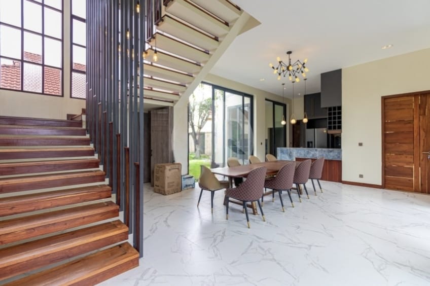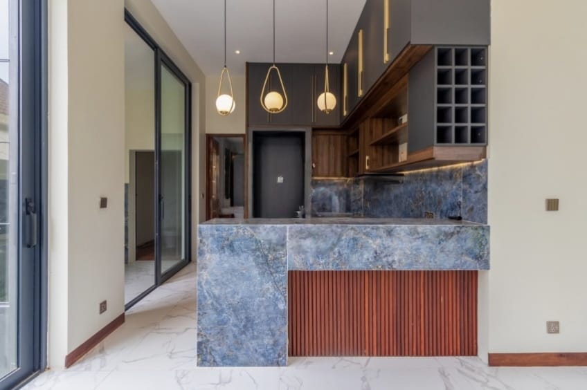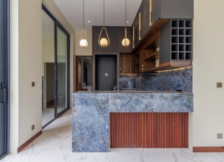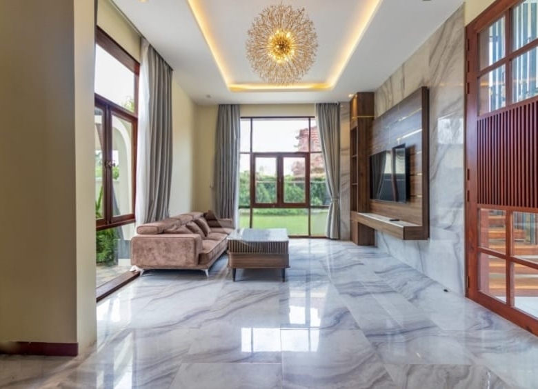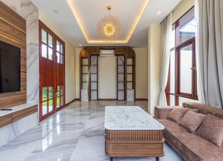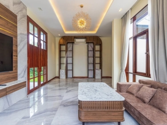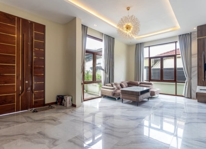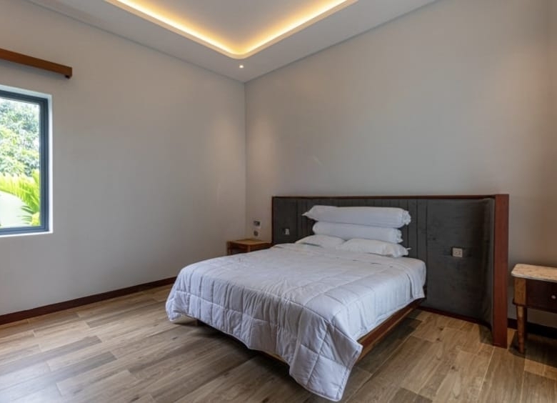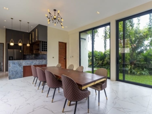 Inside, the villa welcomes you with a stylish L-shaped sofa and mounted flatscreen TV, paired with an eight-seater dining table beside the peninsula kitchen. The kitchen is fully equipped with a double sink, stove range, exhaust hood, cabinetry, and a refrigerator with ice/water dispenser. Each bedroom comes furnished with large beds, bedside tables, and wall-attached dressers, while bathrooms feature hot/cold showers for added convenience.