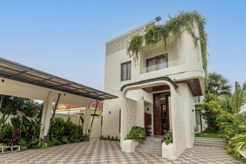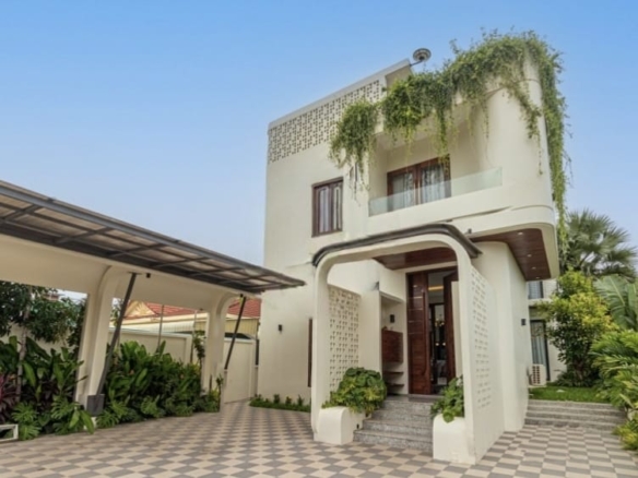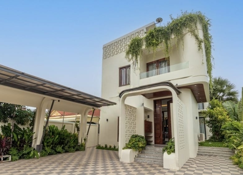 With ornate greenery draped over its curved façade, this villa exudes tranquility, security, and modern luxury—all within one of Siem Reap’s most sought-after neighborhoods. Designed for family living, it offers four spacious bedrooms and beautifully lit common spaces that bring everyone together in comfort and style.