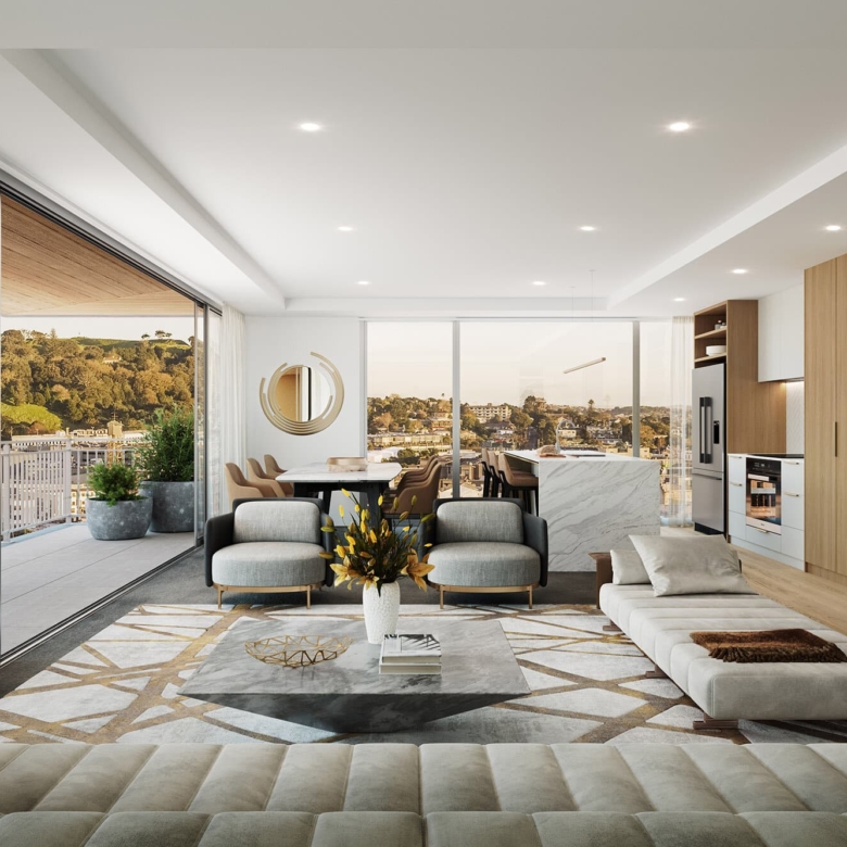 Living & Dining:An open-plan living/dining area flows seamlessly into a loggia (winter-garden) — a versatile space with sliding/folding glazing that merges indoor comfort with outdoor beauty. Enjoy sweeping views of Rangitoto, Mt Eden, and the Auckland skyline, perfect for alfresco lounging or entertaining.