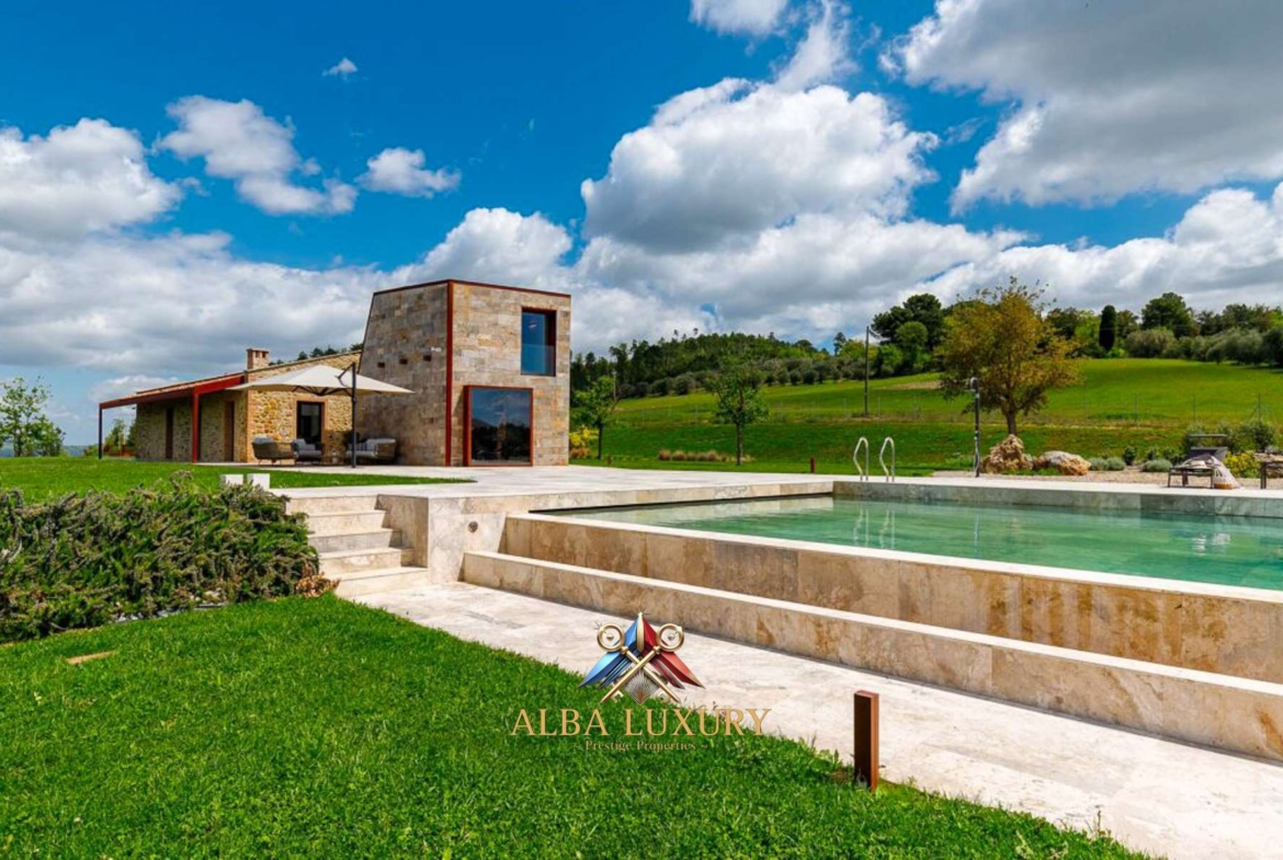 Immersed in the beautiful countryside of Volterra, in Tuscany, this villa represents a perfect combination of tradition and modernity. Designed by a renowned architect, it has been built following carefully studied criteria to enhance both the authenticity of the territory and contemporary comfort. Its privileged position, open and sunny, offers an unparalleled view of the gentle Tuscan hills, ensuring tranquility without giving up proximity to the historic center. The villa is spread over two levels and reflects the style of classic Tuscan country residences. The main body, entirely on one level, is enriched by two characteristic turrets, connected to the central structure through elegant corridors with glass windows. The living area is the beating heart of the villa and is embellished by a panoramic glass wall with a spectacular view of the pool that creates a seamless bridge to the garden. The open space design of the living spaces allows for a direct connection between the dining room and the living room perfectly integrated with a modern open space kitchen. The dining and breakfast area harmoniously blend with the outdoors, where a beautiful canopy invites moments of relaxation immersed in nature. From here, you can access the first turret, a true architectural gem: on the ground floor, a bright dining room with a garden view creates an elegant and convivial atmosphere, while upstairs there is a study with a bathroom, ideal as a workspace or perfect fifth bedroom for guests. On the opposite side of the villa, a refined hallway leads to the sleeping area, designed for maximum comfort and privacy. Here are two large bedrooms, each with its own private bathroom and a laundry room. Through an evocative glass corridor, you reach the second turret, an exclusive and private space. The lower floor houses a cozy living room, while the upper floor features a refined bedroom with a bathroom, perfect for offering guests a unique experience of tranquility. Thanks to its independent entrance, this turret is ideal for hosting friends or relatives. The villa’s garden, an oasis of peace and beauty, is meticulously cared for and framed by the Tuscan nature. At the center of this paradise is a spectacular pool, an irresistible invitation to immerse in absolute relaxation. The stone solarium and elegant paved areas create perfect spaces to enjoy the sun, organize dinners under the stars, or simply be lulled by the magic of nature.,