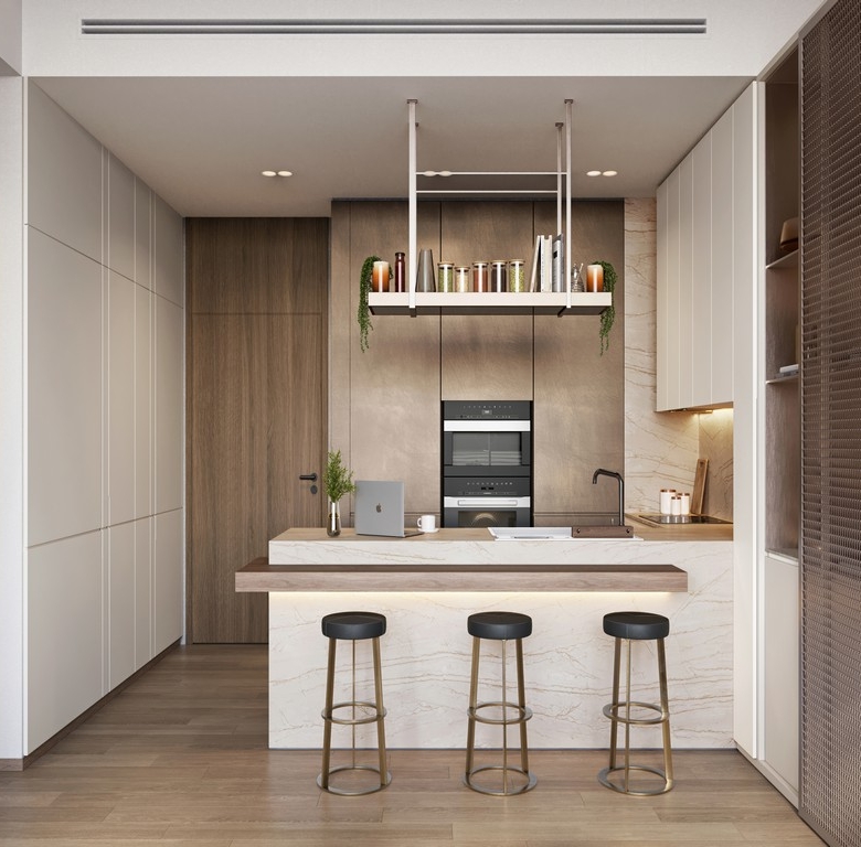 Kitchen: Modern, fully equipped kitchens featuring high-end appliances and sleek cabinetry.
