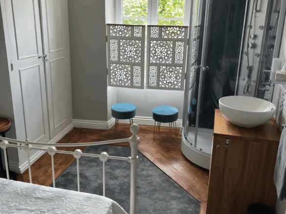 The chateau’s accommodation is equally impressive. A majestic, dual-aspect staircase leads to the private quarters, beginning on the first floor with four stunning ensuite bedrooms. Each is individually styled with the finest quality linen and furnishings, ensuring a unique and luxurious experience for every guest. The top floor offers additional lovely bedrooms, two family bathrooms (one with a luxurious free-standing bath), and a charming dorm-style room with four single beds, perfect for younger guests or group stays. An additional lounge on the top floor, equipped with a smart TV and a PlayStation, adds a modern touch to this otherwise classically beautiful home, making it a perfect retreat for families.