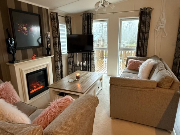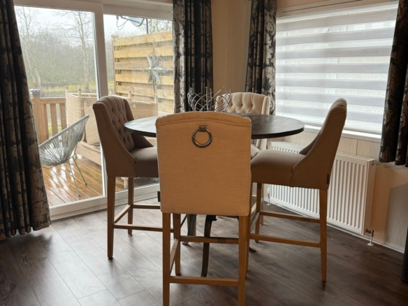 The sale of the lodge includes a comprehensive inventory of fixtures and fittings, allowing for a seamless transition for the new owners. Blinds and curtains are fitted throughout, providing privacy and light control. The modern integrated kitchen comes complete with a fridge freezer and a washing machine, ensuring immediate functionality. The dining area is furnished with a table and chairs, perfect for family meals or entertaining guests. The comfortable lounge includes a television, a coffee table, and a wall unit, creating a welcoming and functional living space.