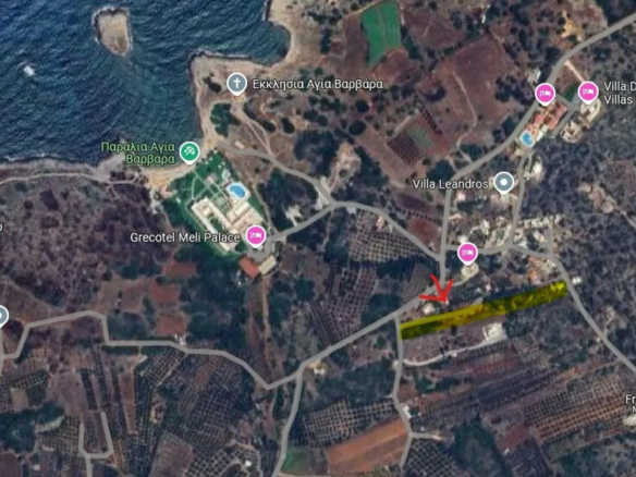 The plot is situated in Agia Varvara, a serene area near the picturesque fishing village of Sisi (also spelled Sissi), within the municipal unit of Vrachasi in the Lasithi Prefecture of Crete. This region is a testament to Crete’s authentic charm, far enough from the bustling, overly commercialized tourist hubs, yet conveniently accessible to all necessary amenities and attractions.