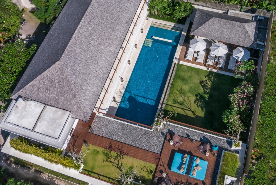 Built in 2012, the interiors are fresh with white walls and smooth creamy Palimanan stone floors, accented by warm honey-hued timber, modern impressionist artwork, richly textured furnishings and a smattering of Indonesian ethnic artefacts. Set on 900 sqm of land with a property size of 700 sqm over 2 levels, the villa has a spacious open plan living area with a grand dining table with views of the pool and pretty garden. There is also an entire area dedicated for staff and parking for 5 cars.