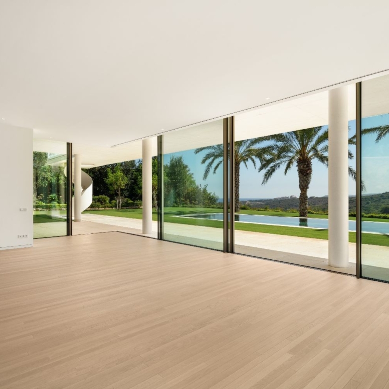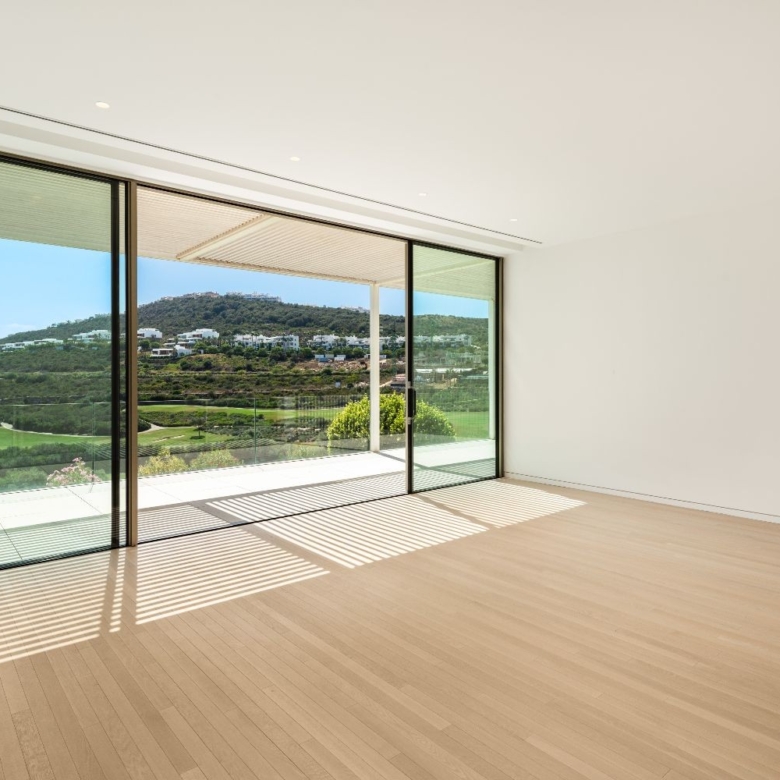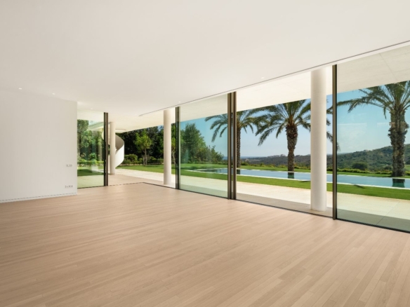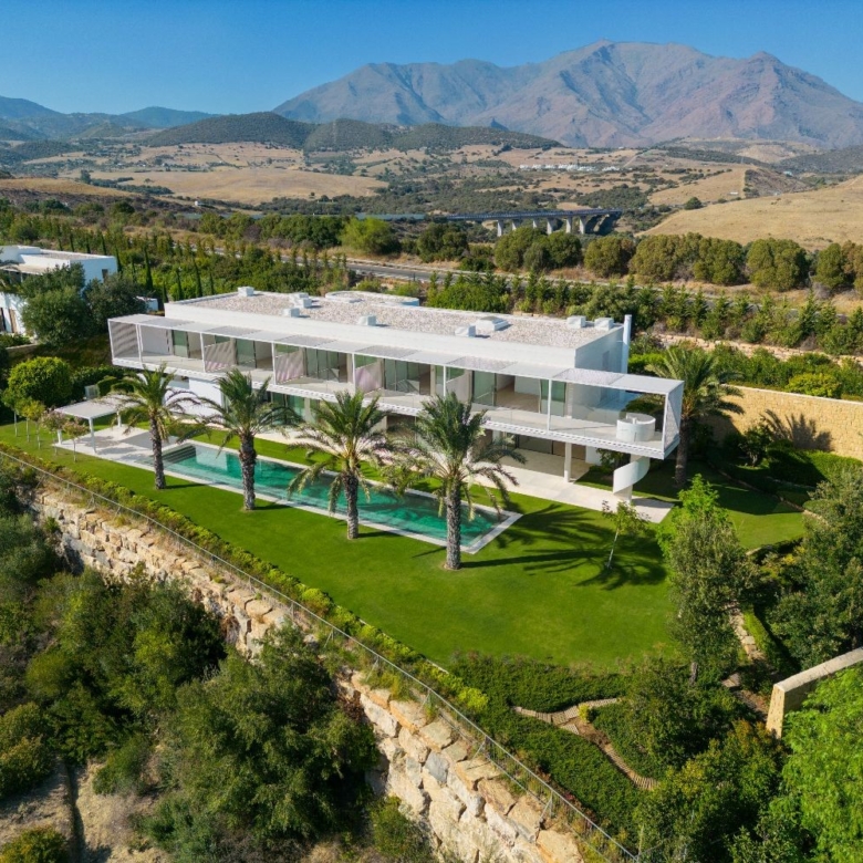 Exuding opulence and refinement, this exceptional villa redefines the very notion of luxury golf resort living. Positioned on an elevated plot, it offers breathtaking panoramic views of the golf course and Mediterranean, while its expansive outdoor areas encompass meticulously manicured gardens and a magnificent swimming pool. Enveloped by lush palm trees and abundant flora, this residence provides an exquisite outdoor sanctuary for year-round enjoyment. Bathed in natural light, thanks to an abundance of floor-to-ceiling glass doors, the ground floor seamlessly connects to the garden, fostering a harmonious indoor-outdoor flow. The property is distributed over 3 floors, with a basement housing a laundry room, facility room and bespoke wine cellar. Access to the basement was cleverly integrated to the property through a hidden cylindrical door. The interior spaces are elegantly designed, located on the ground floor level – features neutral soft tones and unique materials that imbue the home with an unparalleled sense of individuality. The kitchen, equipped with top-of-the-line Gaggenau appliances, showcases bespoke cabinetry and a stylish kitchen island, while the light wooden flooring throughout the house evokes a serene and tranquil ambiance. The property’s manicured landscapes, carefully curated within its boundaries, create a captivating backdrop visible from the ground floor. The upper level is dedicated to the bedrooms, each with its own private terrace and separated by stunning white dividers. The architectural prowess of Vicens & Ramos is evident from every angle, with the property’s impressive entrance leaving a lasting impression on all who arrive. With its privileged frontline golf position, awe-inspiring views and an unwavering commitment to excellence, this masterpiece stands as a truly incomparable residence within the exclusive Finca Cortesin Resort.