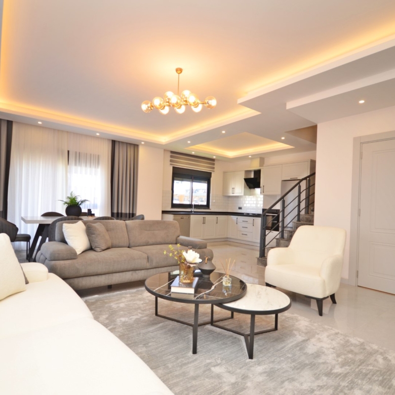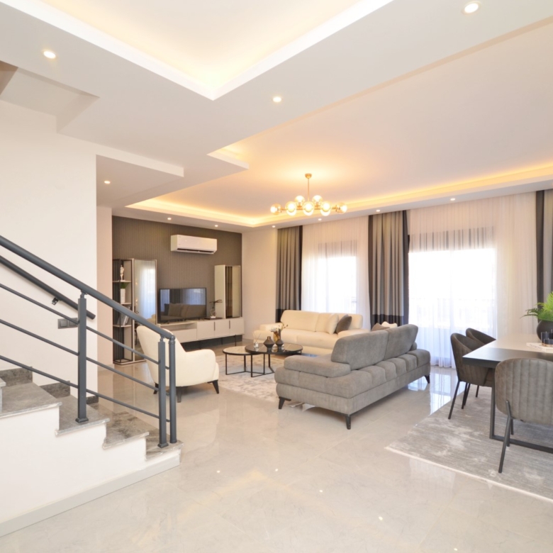 As atop property for sale in Alanya, it includes world-class on-site amenities: indoor and outdoor pools, Turkish bath, sauna, jacuzzi, fitness center, massage rooms, cinema, game areas, and sports courts for football, tennis, and basketball. You’ll also find barbecue zones, camellias, a generator, elevators, both open and covered parking, and 24/7 video security. This duplex offers a unique blend of luxury, location, and lifestyle in Oba’s best residential complex.