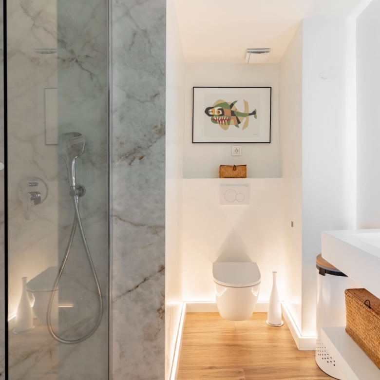 The thoughtfully designed open-plan layout features a fully equipped modern kitchen flowing seamlessly into the spacious living and dining area, which opens directly onto a private terrace — an ideal space for both quiet relaxation and stylish entertaining.