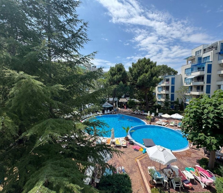 First sea line! 1 BED apartment, 62 sq.m., with a pool view, in Excelsior, Sunny beach, 70 m to the sea. One bedroom apartment for sale just a few steps away from the beach in the complex “Excelsior” in Sunny Beach! The apartment is located on the 2nd floor and has an area of 62 m2. It consists of an entrance hall, living room with kitchen, bedroom, bathroom and a balcony overlooking the pool of the complex. The property offers nice and elegant furniture. It is ready to use and is perfect for renting out. Excelsior Aparthotel is an enclosed complex with a large well-maintained area. The complex is conveniently located, the second line to the sea, and only a 5 minute walk from the center of Sunny Beach. The advantages of the resort of Sunny Beach are clean air and water, which is confirmed by the “Blue Flag” award, as the resort is designed away from factories and major cities, a wide and long beach, full infrastructure, a wide range of options for outdoor activities and relaxation. The location of Excelsior is more than perfect! Only 70 meters to the elegant beach with golden sand and shallow entrance to the sea. Within walking distance of the main promenade and all the attractions and best restaurants in the resort. Complex facilities: · outdoor swimming pool with childrens section · childrens playground · 3 lifts · bistro · open gym · shops · reception · security Annual maintenance fee – 12 EUR/sq.m.