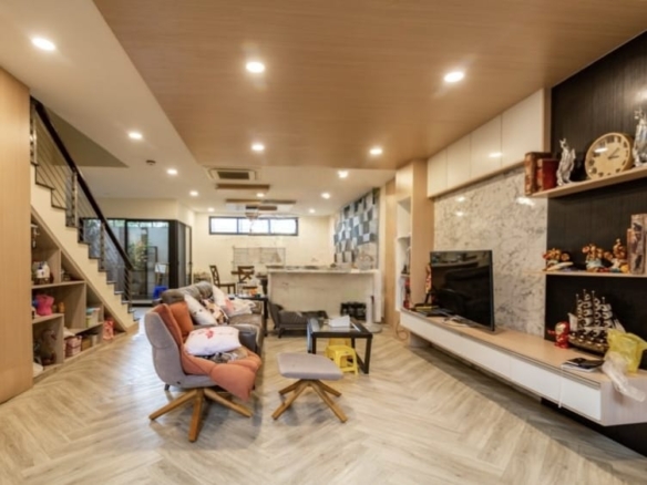 Inside, the villa welcomes you with a spacious receiving area fitted with centralized air conditioning, perfect for entertaining guests. The modern kitchen is thoughtfully designed with an island counter and has direct access to an atrium-style rear space—featuring potted greenery and a functional area for laundry. The kitchen comes fully equipped with a microwave, oven, cooker, range hood, sink, and pantry, all seamlessly built into the utility counter for convenience and efficiency.