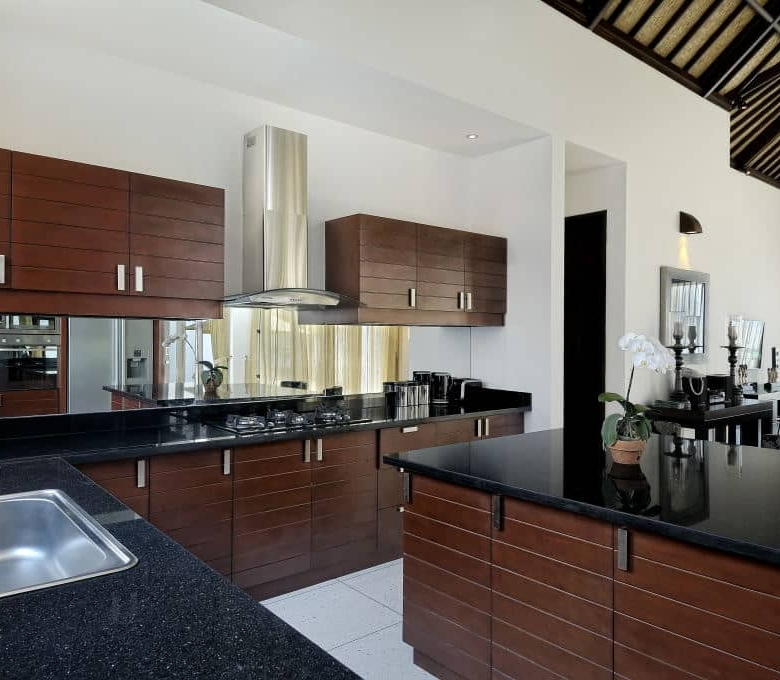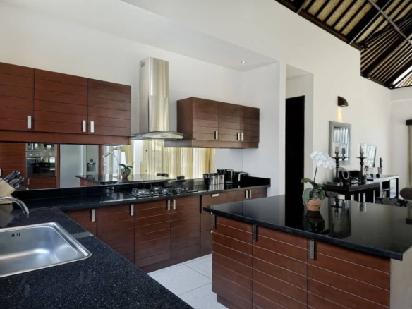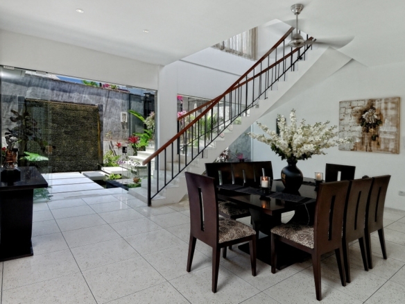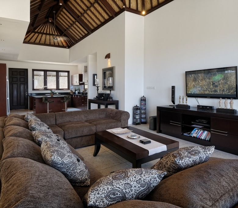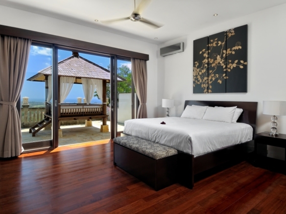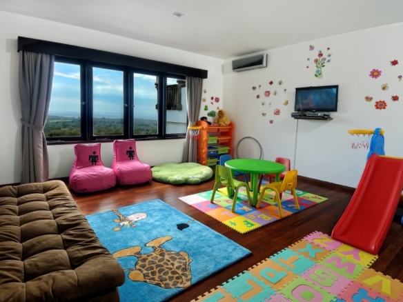 The villa faces north-west and consists of 4 spacious bedrooms with polished wooden floors along with a playroom with bunk beds. Two rooms can be found on the first floor, two rooms on the second floor and the fifth is located on the ground floor. The ensuite bathrooms are luxurious with double vanities. The master bedroom boasts a large Jacuzzi bath. The living room with its comfortable plush sofa also looks out to breathtaking views. The fully equipped kitchen is a delight to cook in with its large island. There is also staff quarters and parking for 2 cars. A beautiful feature of the villa is its curve stairway but the highlight of this property has got to be the 8 metre infinity pool. The villa comes fully furnished with exceptionally well-appointed designer furniture.