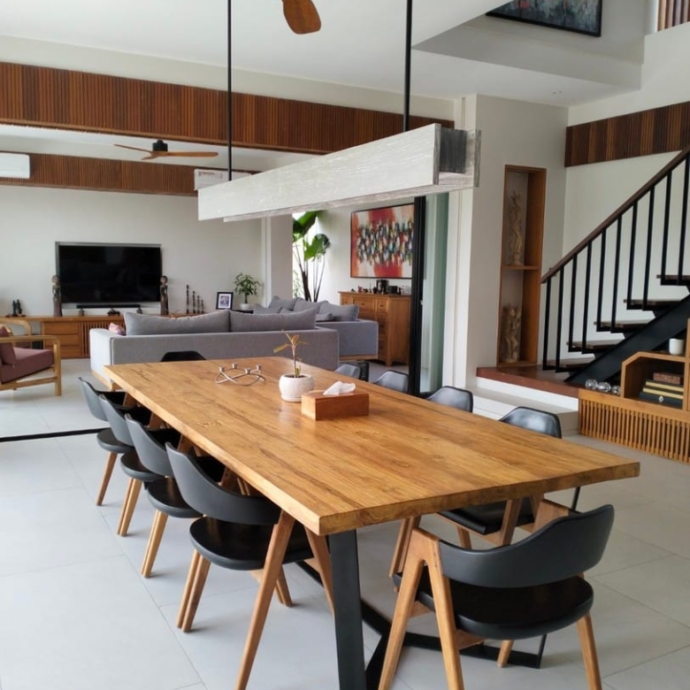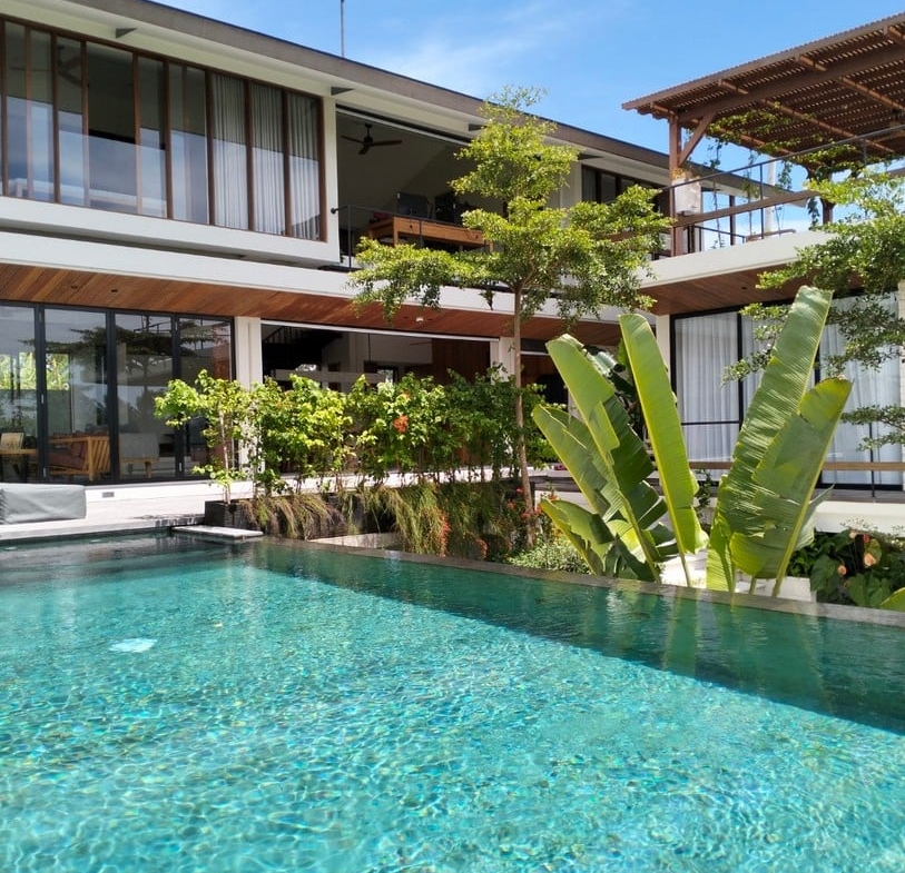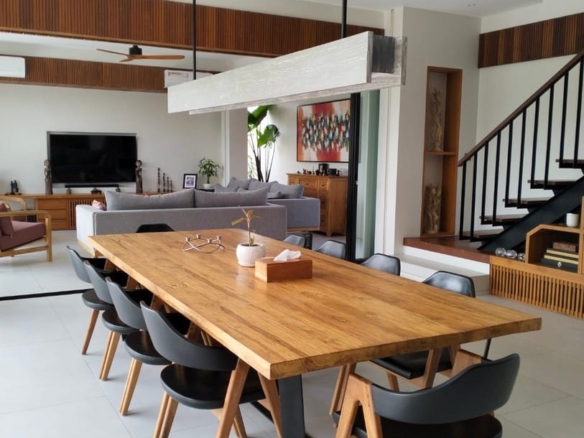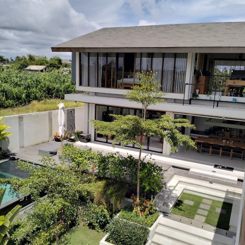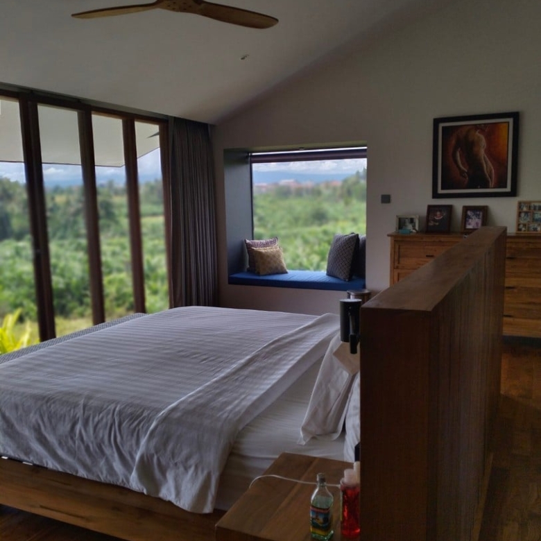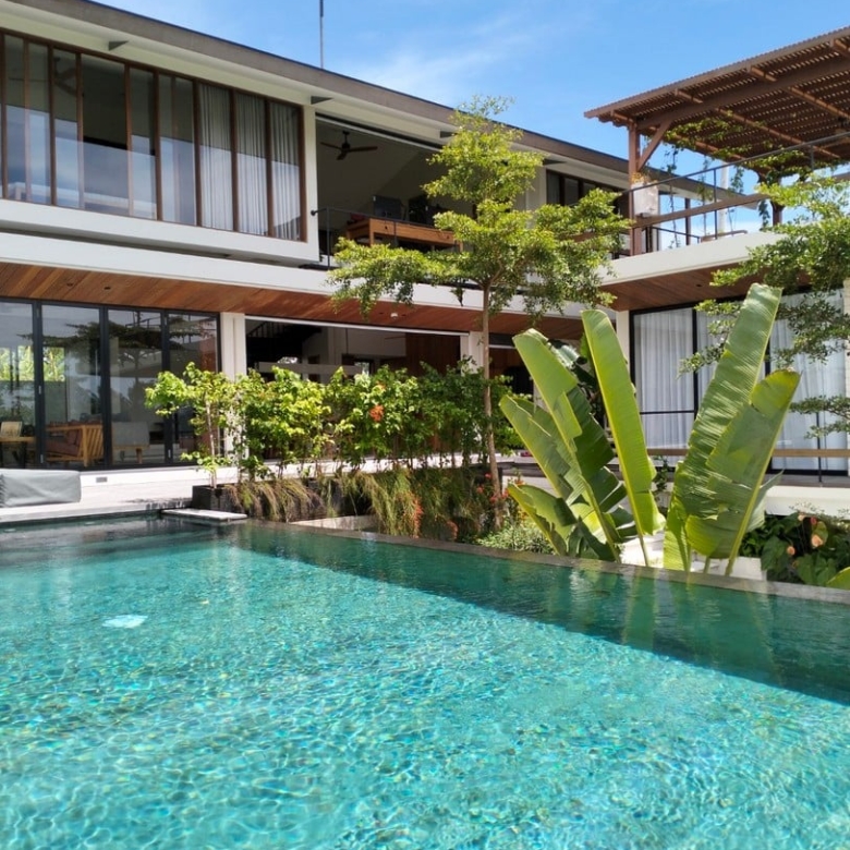 The multi-level, south-facing property features 4 spacious bedrooms, all with adjoining bathrooms. The open-plan living space opens up with large glass doors to views of the swimming pool and rice fields beyond. The pool itself is 9 metres long with a large wooden sundeck. The villa has a fully equipped modern kitchen, guest powder room, staff quarters, and parking for 1 car. An additional entertainment space can be found on the rooftop—the ideal spot for cocktails while watching the sun go down. The villa comes fully furnished with well-appointed furniture and fittings.