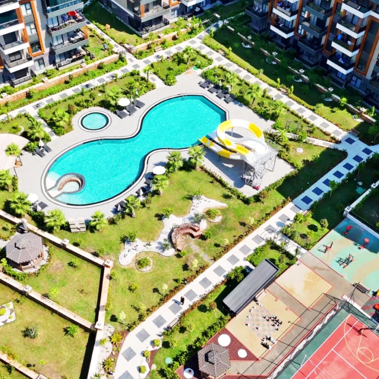 The residence provides indoor and outdoor swimming pools, a Turkish bath, sauna, fitness center, Jacuzzi, and massage rooms for ultimate relaxation. Entertainment options include a cinema, game areas, football, tennis, and basketball courts. Additional features like barbecue areas, camellia seating, a generator, 24/7 security cameras, an elevator, and open/closed parking make this an excellent investment. The apartment is only 1.2 km from the beach, making it ideal for both permanent living and holiday stays.