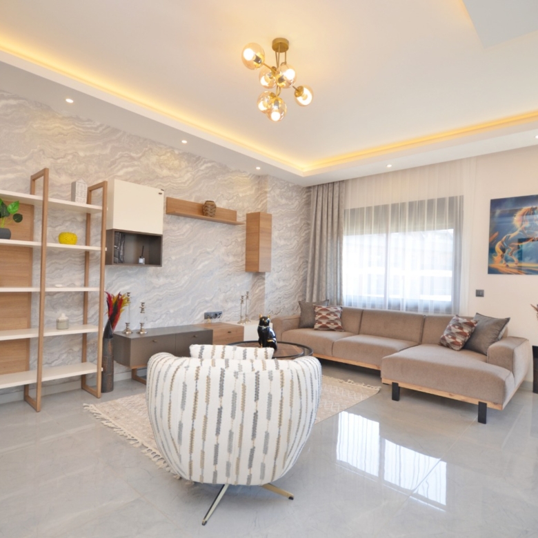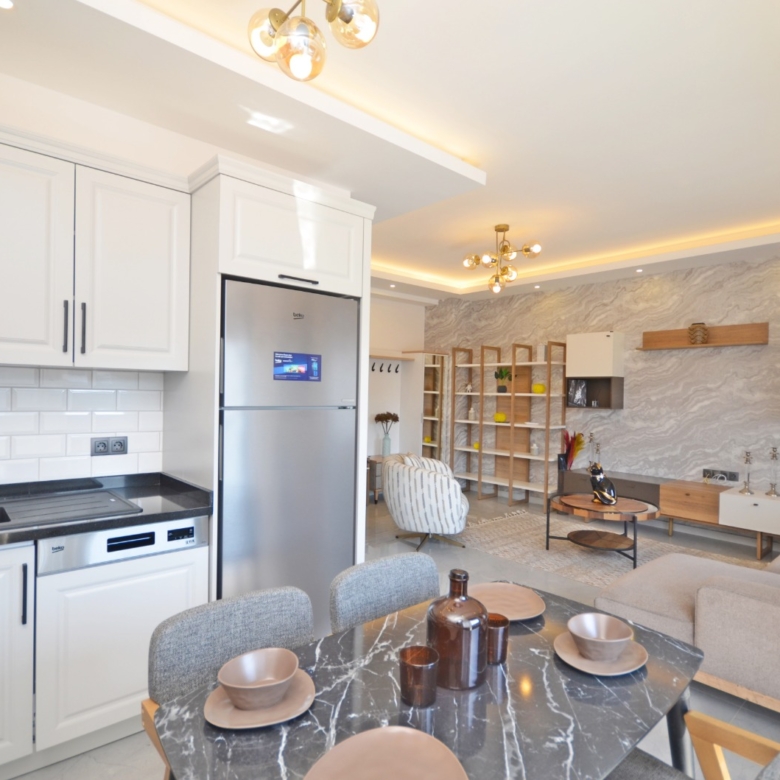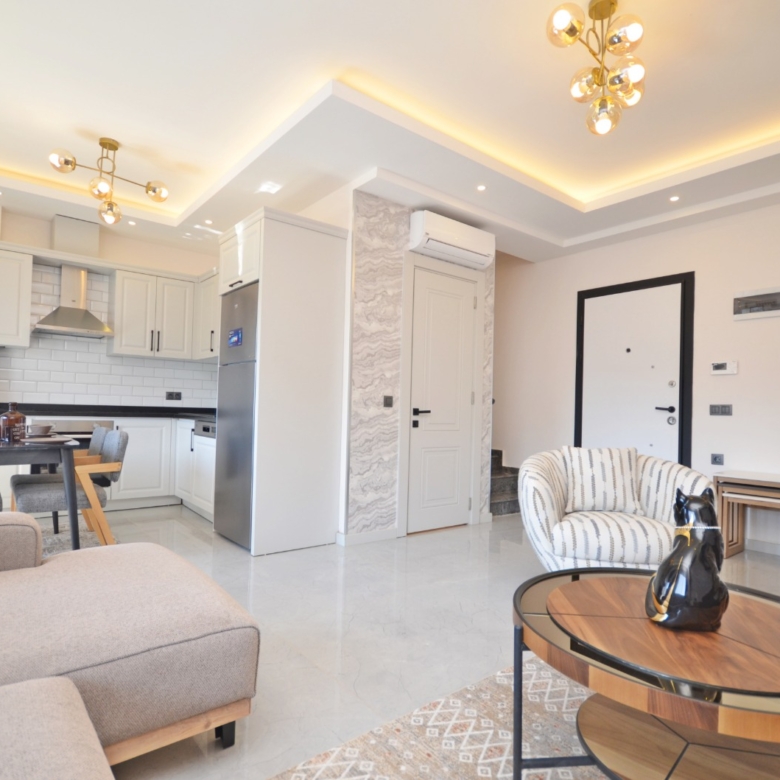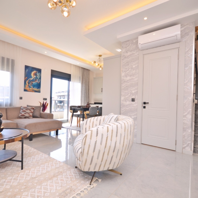 Luxury apartment for sale in Oba – This luxury duplex apartment in Oba is located in the prestigious Kavi Dreams Residence and offers a spacious 121 m² living area. The apartment is fully furnished and features a modern open-plan living space, 2 bedrooms, 3 bathrooms, and 3 balconies with a beautiful pool view. Situated on the 4th and 5th floors, this home is designed for comfort and elegance.