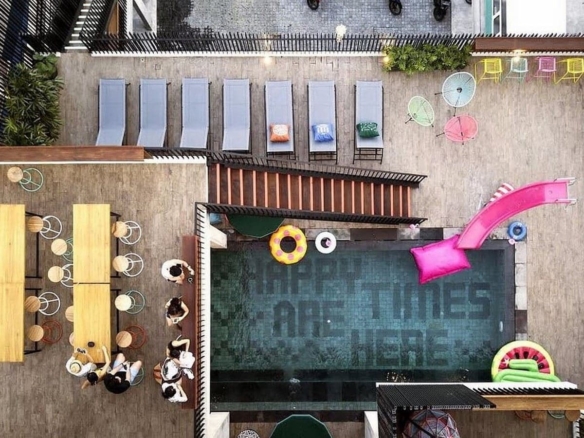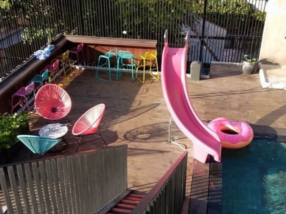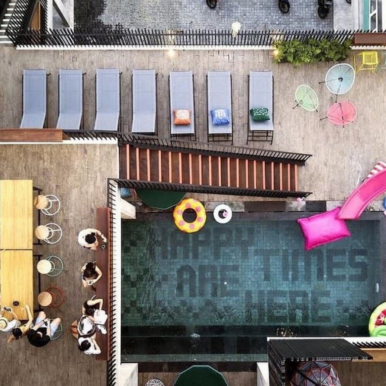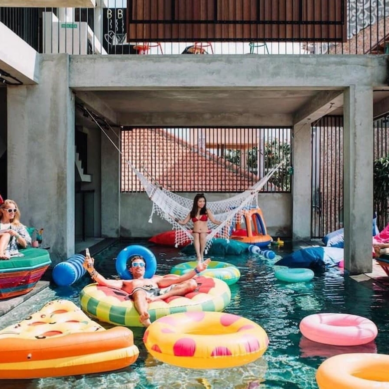 This is a lucrative investment opportunities in the area of Kuta, Bali. Built in 2017 on a 1050m2 plot of freehold land just 450m from Kuta Beach, is a vibrant, fun-filled and hip boutique inn, cafe, & bar for the free-spirited and young-at-heart. Some seriously cute and ‘edgy’ design ideas have definitely gone into the creation of this place, attracting back packers from across the globe, with floats in the pool, swings and sun beds around the side (good spots for Insta pictures!).