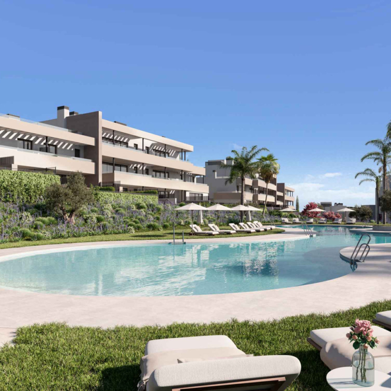 The development features nine blocks with west-southwest orientation, maximising natural light and offering views of the surrounding landscape, some with sea views. Communal areas include gardens, a swimming pool, and a gym. The complex is equipped with a sophisticated security system and first-class wellness facilities. Each home is designed to optimise space, ensuring functionality and aesthetics. Living and dining rooms connect to spacious terraces, and open-plan kitchens are fully equipped with state-of-the-art, energy-efficient appliances. The development is committed to sustainability without sacrificing comfort.