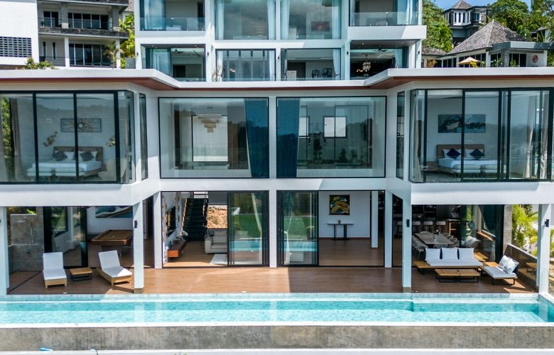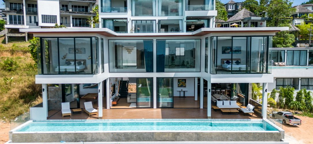 Located on a peaceful hillside near Layan Beach, this elegant 6-bedroom, 6-bathroom luxury pool villa offers refined living with expansive space, natural surroundings, and contemporary design. With a generous built-up area of 940 sqmset on a 414 sqm land plot, this fully furnished residence spans three levels, thoughtfully crafted for privacy, functionality, and breathtaking open views of the lush landscape and distant sea. On the entry level, you’ll find three guest bedrooms, each with en-suite bathrooms, along with a maid’s room, storage, and covered parking for two cars. An elevator provides easy access to the main and upper levels. The central floor features a double-height ceiling in the spacious open-plan living and dining area, accompanied by a fully equipped Western kitchen, separate Thai kitchen, games room, and home study. Floor-to-ceiling glass doors open onto a generous pool terrace with a 19-meter private infinity swimming pool, lounge space, and shaded seating—all perfect for entertaining or relaxing. The upper level offers three additional bedrooms, including a luxurious master suite with walk-in closet and a stunning en-suite bathroom with freestanding tub and dual sinks. A private gym completes the top floor, with all rooms enjoying abundant natural light and partial views of the sea and surrounding hills. Property Features: Price: THB 75,000,000 Land Area: 414 sqm Built-Up Area: 940 sqm Bedrooms: 6 (all en-suite) Bathrooms: 7 Ownership: Thai Freehold or Leasehold Furnishing: Fully Furnished Floors: 3 Private Elevator Swimming Pool: Private infinity pool (19m x 3m) Parking: Covered carport for 2 cars Villa Highlights: Modern hillside design with partial sea and mountain views Double-height ceilings in main living area Open-plan Western kitchen with breakfast bar + separate Thai kitchen Games room and private study Private gym on top floor Elevator across all floors Maid’s quarters, laundry, and ample storage Spacious pool deck with shaded lounge and entertainment area Quiet residential setting with full privacy Location Highlights:Located in Layan, one of Phuket’s most desirable areas, just 5 minutes from Layan Beach and the northern stretch of Bangtao Beach. Enjoy easy access to top lifestyle destinations like Boat Avenue, Porto de Phuket, and the Laguna resort area , all just 10 minutes away. Phuket International Airport is approximately 35 minutes by car. Contact ThaiEstate today to schedule a private viewing or request more information.