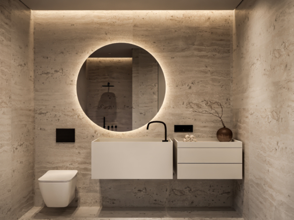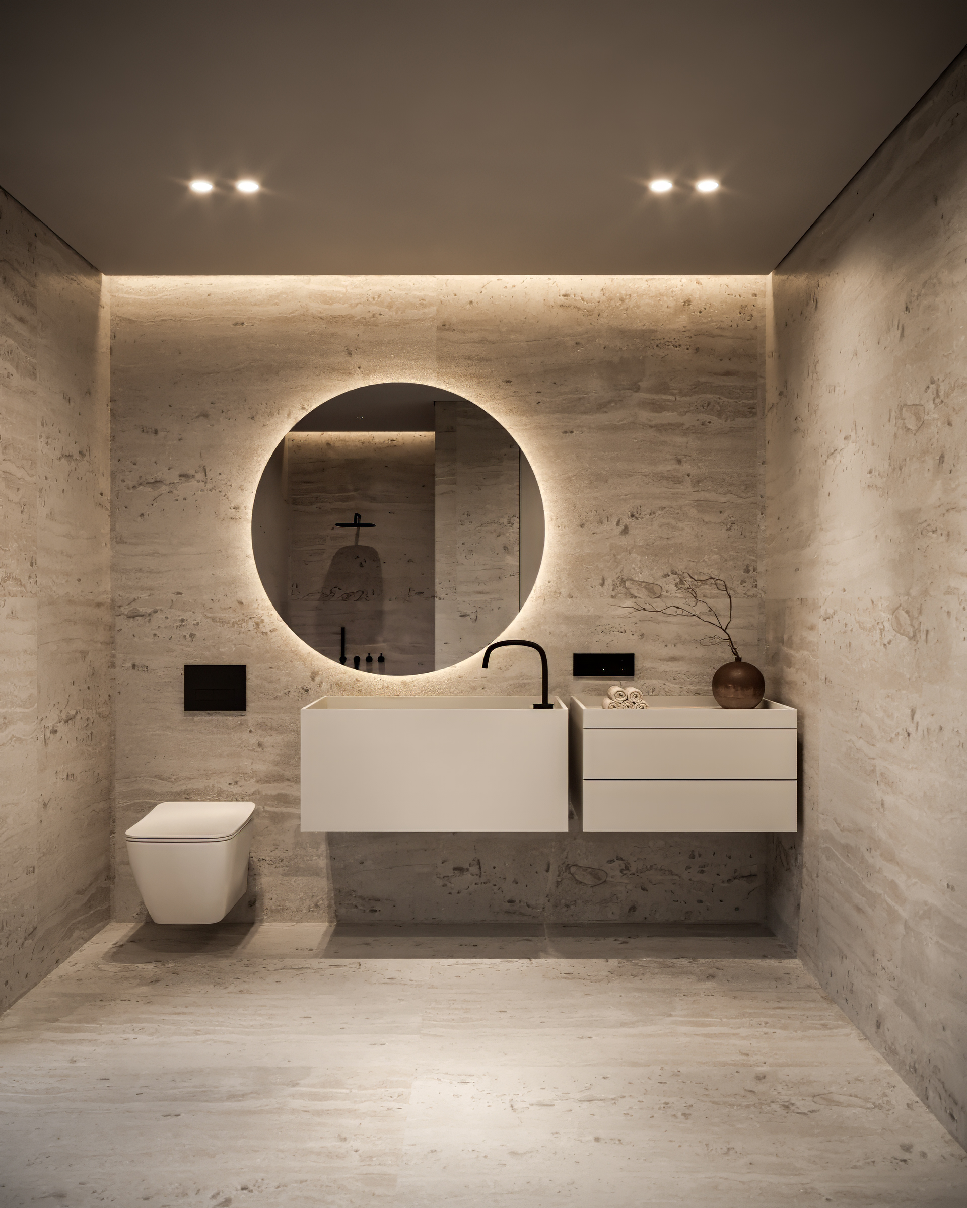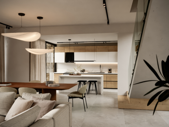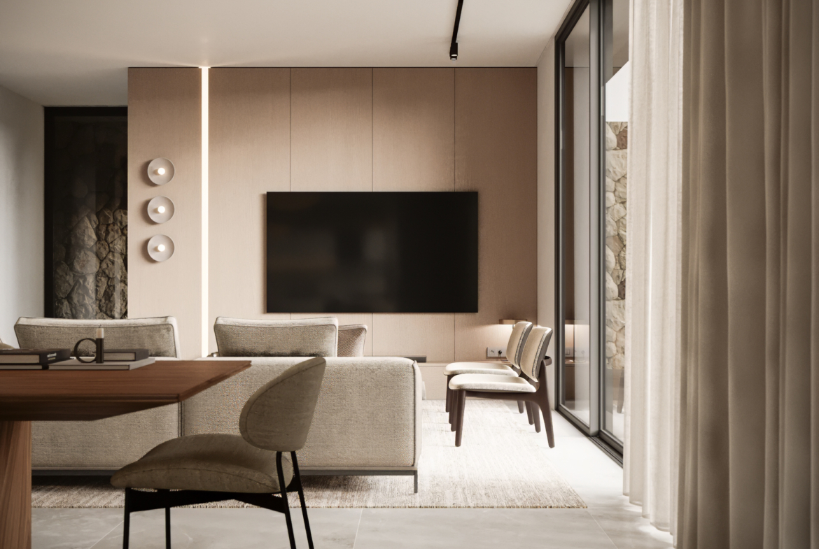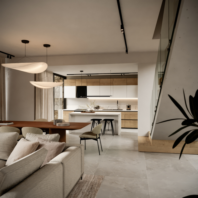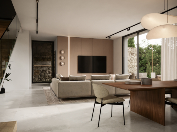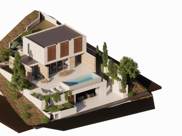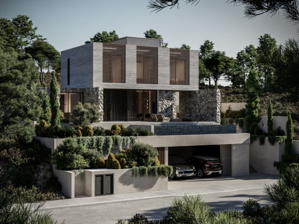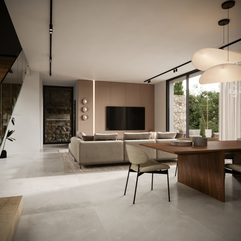 This Hilltop villa features four spacious bedrooms, three bathrooms and an additional guest toilet. Distinguished by the use of high-quality materials, it’s a testament to sophistication. Fairfaced concrete, stone walls, and wood cladding are employed to create a captivating aesthetic, ensuring a unique character.
