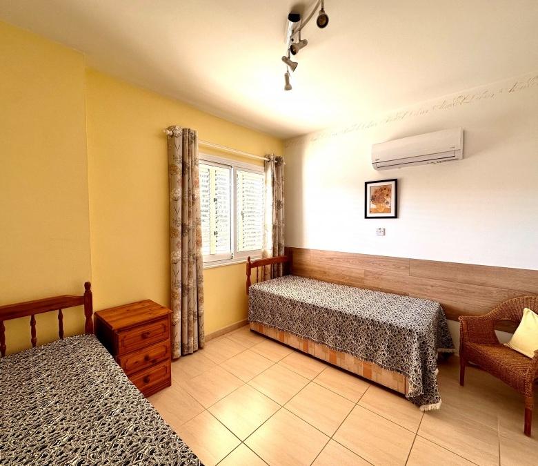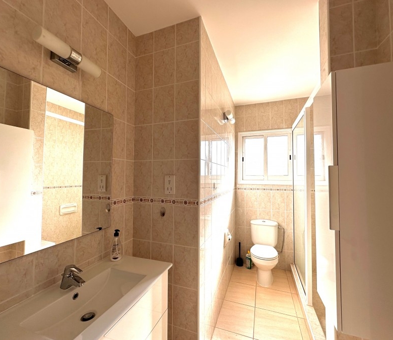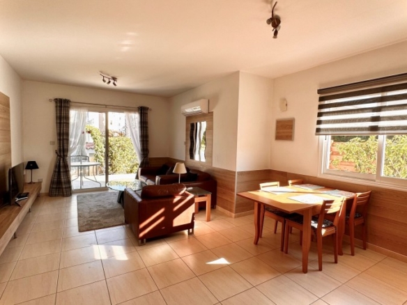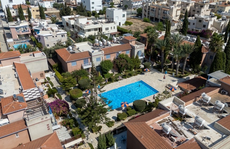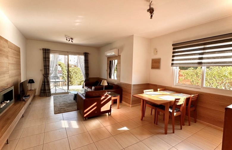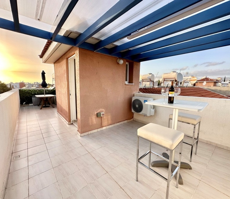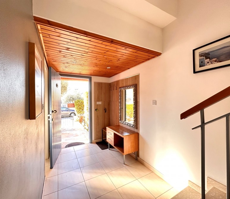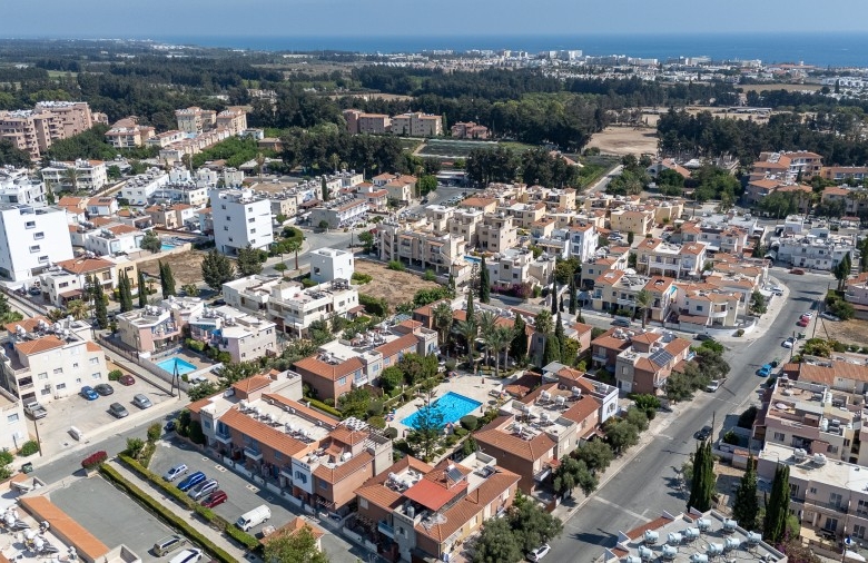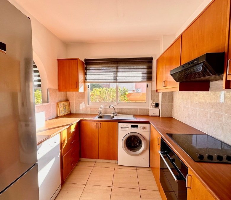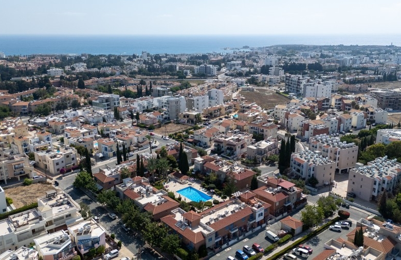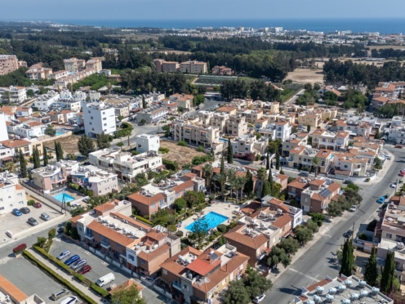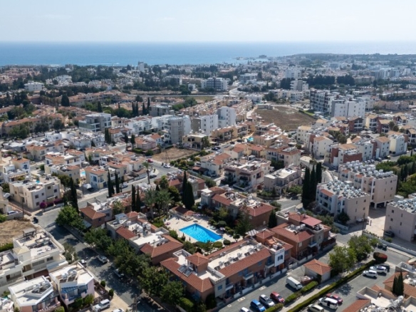 This well-maintained project is located in one of the most desirable areas of Paphos – Universal. Within walking and short distance from the project there are shopping areas, Kings Avenue Mall, schools and universities, city centre and beaches of Pafos. The property has an open plan large living/dining areas and a kitchen. Patio doors from the living area lead out to a good sized veranda and yard, there is also access to the communal swimming pool of the project, Guest WC Upstairs there are 3 large double bedrooms with fitted wardrobes and balconies with pool and town views and a family bathroom. Covered parking available. The townhouse is in an excellent condition.