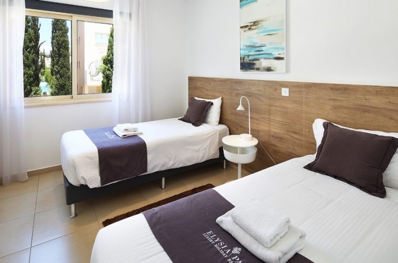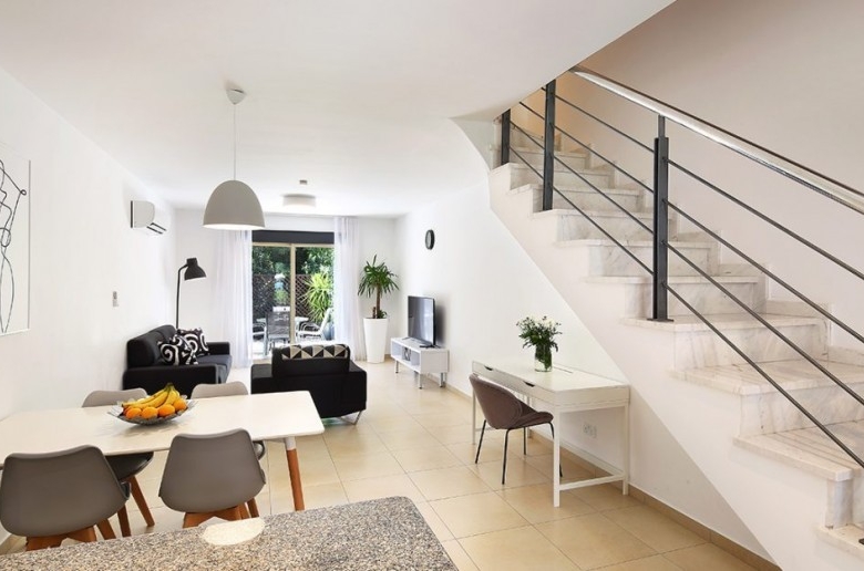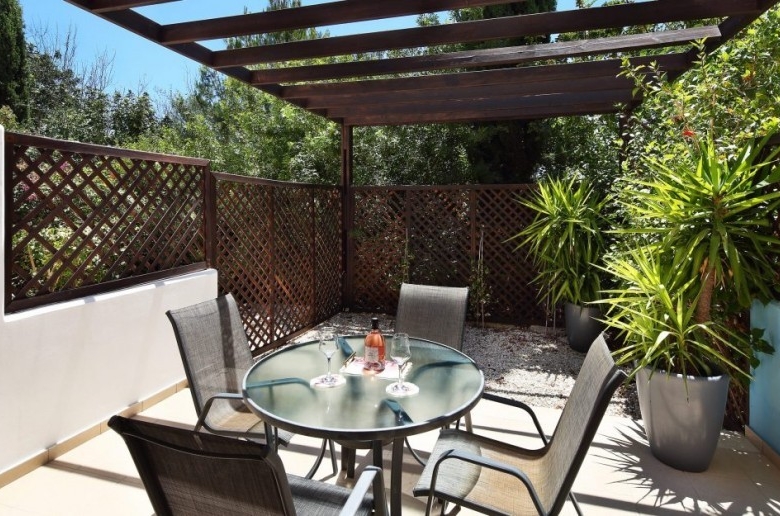 2 bedroom townhouse is located in the most exclusive resort in Pafos, which has been designed to accommodate the comfort, relaxation, and enjoyment of the discerning property owner, offering a wealth of services and facilities unparallel in the area. This spacious townhouse comprises an open plan living and dining area with patio doors giving access to a large partly covered veranda with generous garden space, offering excellent views to the surrounding complex lush green areas. A fully equipped modern kitchen is conveniently located to the right as you enter. A cloakroom is also located on the ground level. On the upper level, there are two large bedrooms with fitted wardrobes and balconies and a family bathroom. The Master bedroom also offers en-suite facilities.