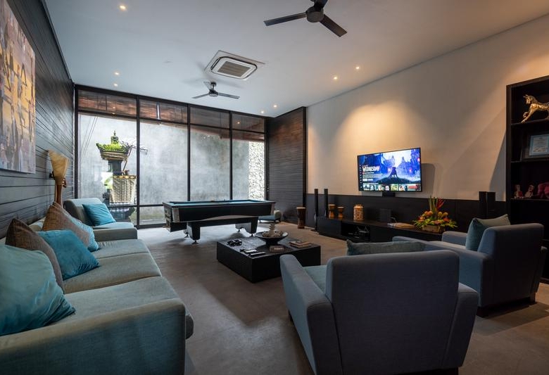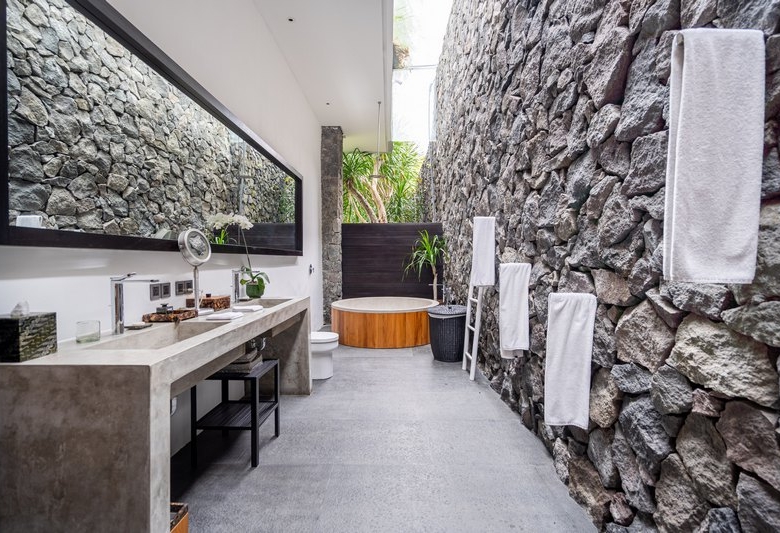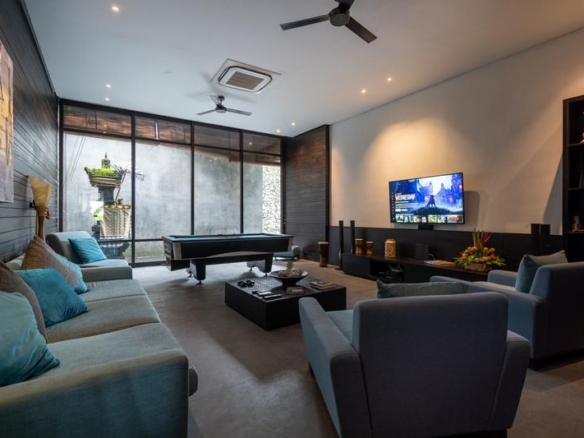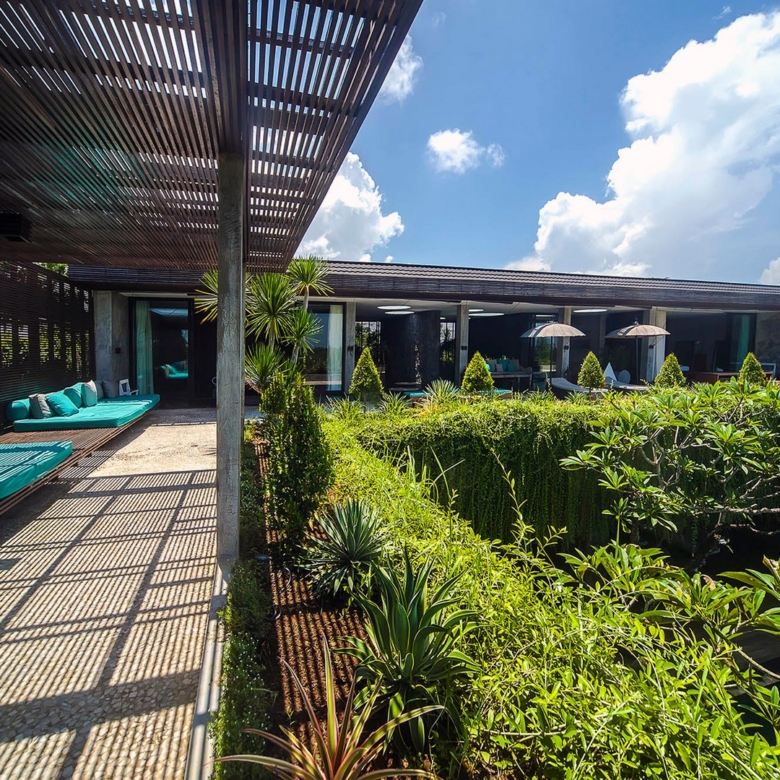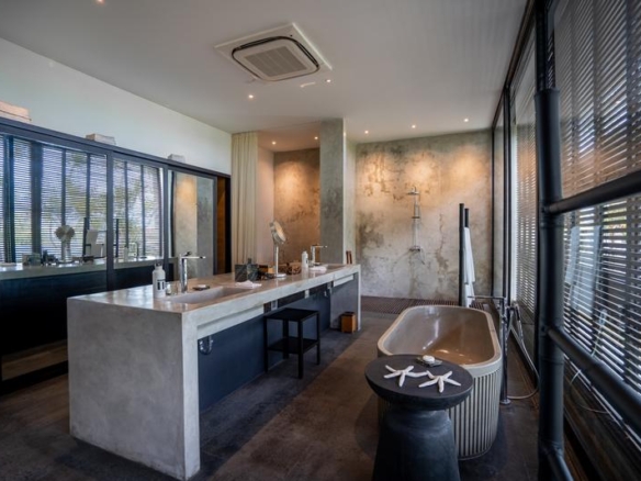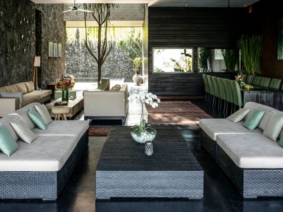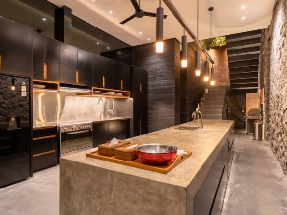 Built in 2009, the iconic 7 bedroom villa embraces space and exudes style with modern minimalist architecture and interior design, with expanses of polished concrete incorporated with local materials and walls crafted from a combination of glass, stone and wood. With 3.7 metre high ceilings, sexy black décor, water features, hanging gardens, custom designed furnishings and state-of-the-art technology, the property is vast on 1500 sqm of land and undeniably chic.