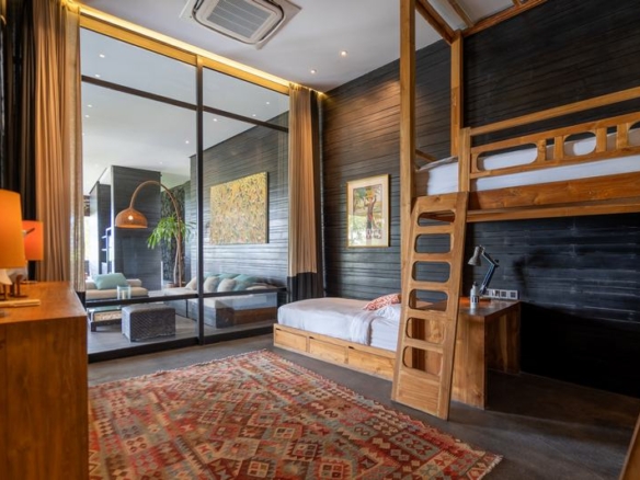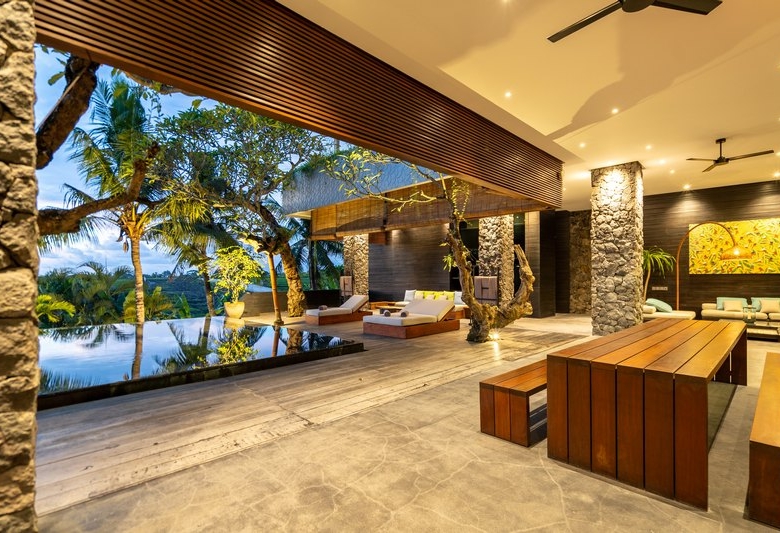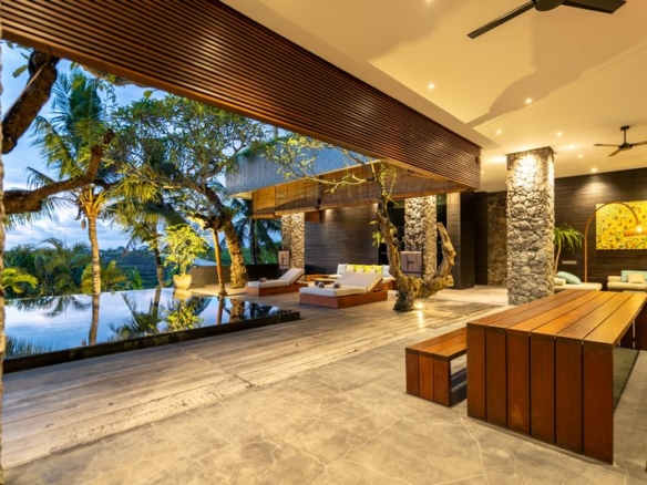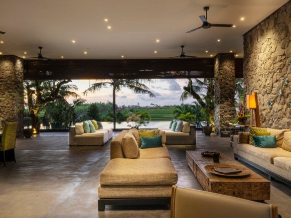 The ground floor houses the living and dining areas and 5 spacious bedrooms with attached stunning bathrooms including authentic Japanese bathtubs. Separated from the living area by a river-rock wall is the fully equipped kitchen with its long island bar. The huge open-plan living area spilling seamlessly onto the pool terrace provides additional entertainment space. From the pool deck, broad wooden ‘amphitheatre-style’ steps lead down to a large flat lawn edged by the rice terraces. On the upper floor two more bedroom suites open onto an enormous terrace with large oversized daybeds overlooking gorgeous views. Other features include a large entertainment/media room and 2 car garage.