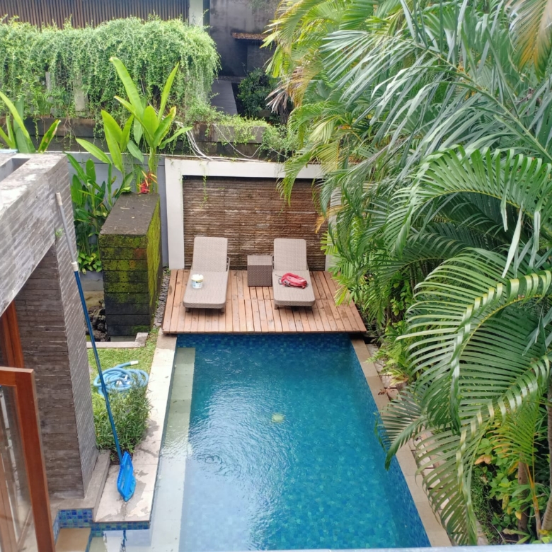 Discover the perfect oasis in the heart of Seminyak, with this FREEHOLD contemporary villa. Located just a stone’s throw away from the world-famous Seminyak Beach, this villa is part of a charming resort community comprising of 10 self-contained villas, nestled within a serene tropical garden.This 2-storey villa is set on 213 sqm of land, with 249 sqm of living space that has been thoughtfully designed with a contemporary touch. Featuring 2 spacious bedrooms with ensuite bathrooms, one conveniently located on the ground floor. The open-plan living and dining areas flow seamlessly onto the outdoor area, allowing for a perfect balance of indoor-outdoor living. The inviting 7m x 3m swimming pool is perfect for a refreshing dip or a leisurely soak in the sun. The fully equipped kitchen adds to the convenience of living and entertaining guests. The villa’s south-facing location ensures that natural light fills every corner of the property, while the upstairs bedroom boasts a huge balcony with a relaxing gazebo – perfect spot for massages. The villa is beautifully furnished and includes a shared car park, accessible via a 5-metre asphalt road.With its Pondok Wisata license and its fantastic location and amenities, this property is a perfect investment for the rental market. Management and maintenance services are available, providing everything necessary to welcome your guests and keep your investment in top condition. Take advantage of this rare opportunity to own an income generating villa in the heart of Seminyak, just a short stroll away from the beach, and experience the best of Bali’s vibrant tourism district.Nearby: Seminyak Beach 250 m, La Planca Bali 500 m, Ku De Ta 800 m, Seminyak Square 1 km, Louis and Friends Fitness 1.7 km, Mirror Lounge & Club 1.7 km, Potato Head 1.8 km.