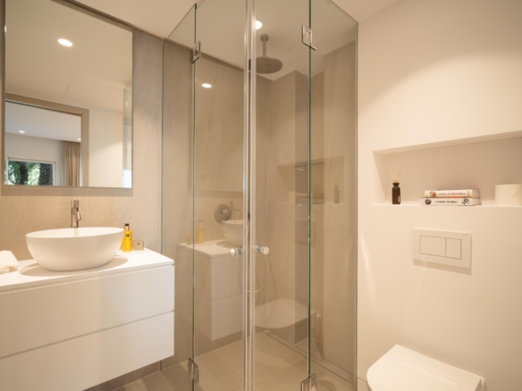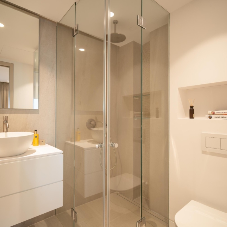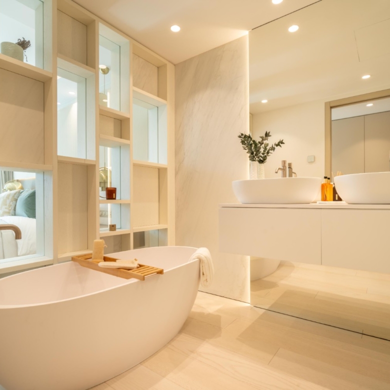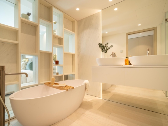 The apartment features three spacious bedrooms, each thoughtfully designed to prioritise comfort and privacy. The master suite includes direct terrace access and a luxurious ensuite bathroom complete with a double vanity, freestanding bathtub, and walk-in shower.