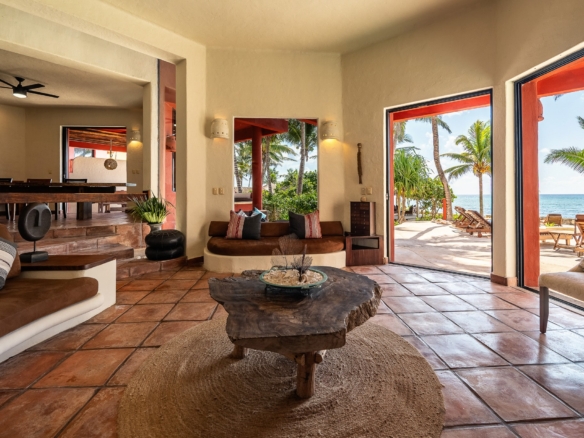 Outdoor spaces are designed for relaxation and entertainment, with a large infinity-edge pool, beachfront lounge areas, and multiple palapas offering shaded retreats. The villa also includes a gated entrance, 24-hour security, and lush gardens, creating a private sanctuary along the coastline.
