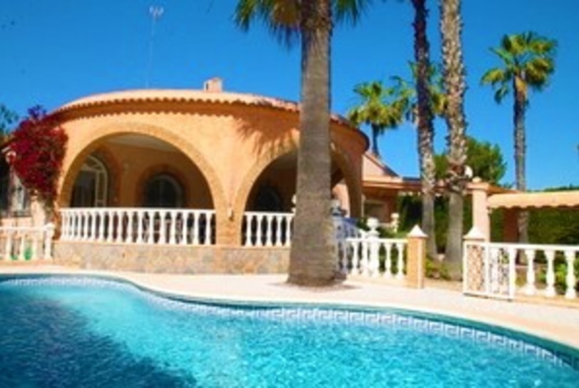 Magnificent Mediterranean-style Villa with 4 bedrooms and 3 bathrooms, built on an 800 m2 plot, in the elevated area of TorreMarina, just 3minutes walk from the glorious La Mata beach and in an enclave surrounded by all kinds of services and amenities. This magnificent Villa is built all in one level with a large circular covered terrace at the front,overlooking a kidney shaped pool. An open terrace with BBQ and a covered bar at the back of the house. A covered parking for two cars and a large garden with cypress and palm trees. The distribution of the Villa consists of an entrance hall with access to the living and dining area. A fully equipped independent kitchen with access to the rear terrace and the BBQ area. A hallway from where you can access to 2 double bedrooms with fitted wardrobes and a shared master bathroom. A third double guest bedroom with fitted wardrobe and ensuite bathroom and themaster bedroom with dressingroom and ensuite bathroom with doublesink and bathtub. At the end of the hall there is a door access to the garage. The villa comes fully furnished and equipped, has propane gascentral heating with radiators, hot and cold air conditioners and a 1.500-litre water tank with a cistern for consistent water pressure in the houseand garden. This privileged plot is considered Residential and Commercial,an area of high tourism with a great investment potential and a trueopportunity that doesn ́t arise every day.