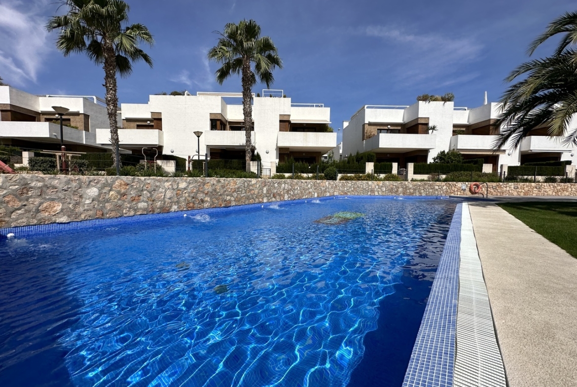 Immaculate and very well presented penthouse apartment for sale in a prime location of La Zenia. Built by the famous well-respected builder TM this property is located in the heart of La Zenia minutes from Zenia Boulevard, numerous shops and restaurants, bars and supermarkets and only a short walk to the beach. The slick apartment has a very bright open plan living and dining room with high ceilings and patio doors leading outside to a sunny terrace overlooking the spectacular swimming pools and jacuzzi within the manicured gardens. Back inside is a fully equipped American syle kitchen with integrated appliances along with access to an independent laundry and utility room. There is an impressive master bedroom, complete with en-suite bathroom and patio doors providing lots of natural light along with access to the terrace. There is an additional double bedroom and a family bathroom. This penthouse also boasts a huge private solarium which is accessed via an internal staircase. The 66m2 solarium boasts a brand outdoor kitchen and bbq area and has been finished with retracting sun-shades.