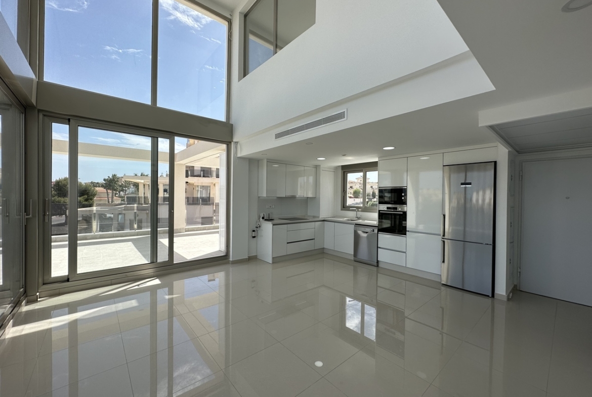 One of a kind Duplex Apartment for sale in the heart of La Zenia with impressive feature floor to ceiling windows, boasting spectaculare sea views. This brand new key ready 89m2 apartment is built over two levels with a huge living and dining area, open plan kitchen, double bedroom and guest bathroom all on the lower level. The apartment is located on the corner of the building and also enjoys a very large 56m2 private terrace which can be accessed from the main living area and ground floor bedroom. Upstairs there are 2 en-suite bedrooms both with sea views. This duplex apartment is sold equipped with kitchen appliances and white goods, pre-installation of air-conditioning, electric blinds, underfloor heating in the bathrooms along with underground parking and storage.