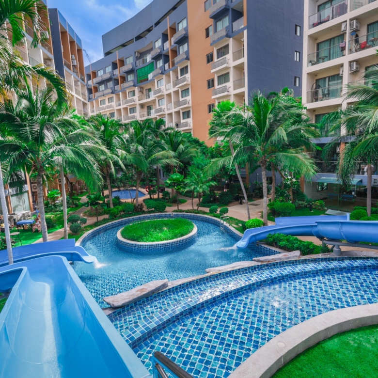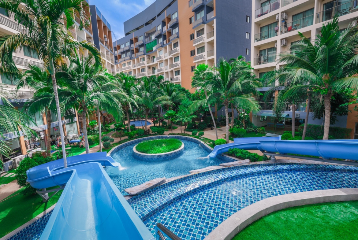 The resort is quietly tucked away in a well-developed area of Jomtien, about 5 minutes from the beach and close to local markets, cafés, and convenience stores. Public transport and main roads are easily accessible, and central Pattaya is just 15–20 minutes away.