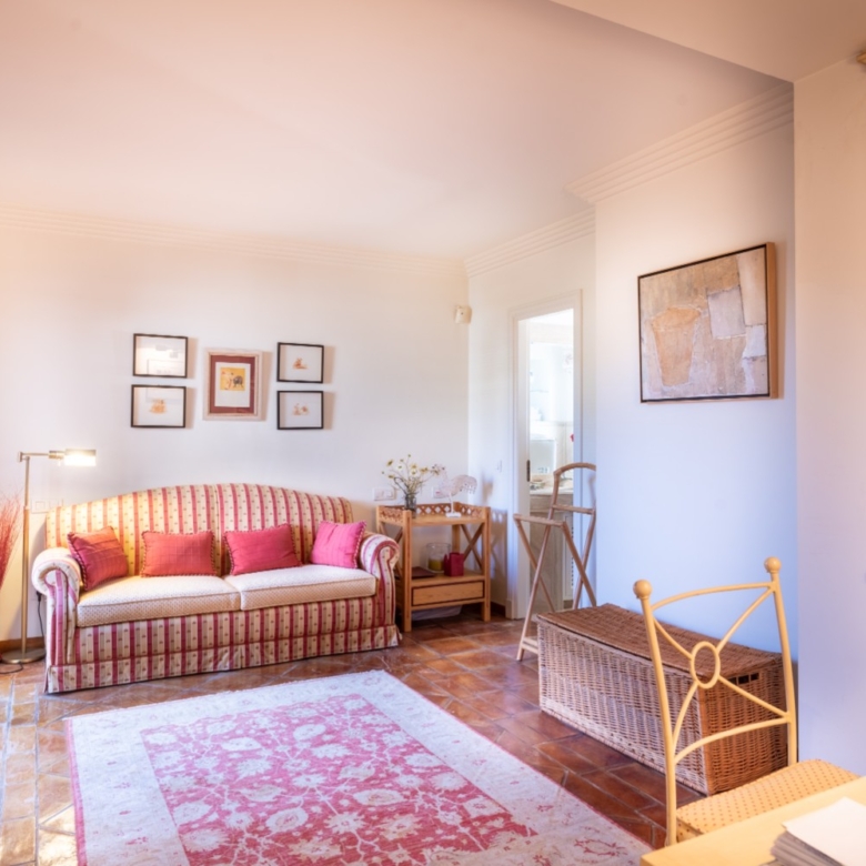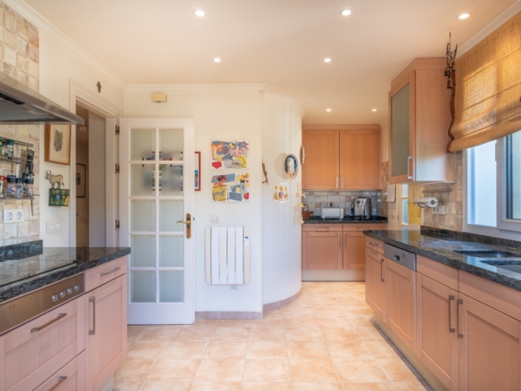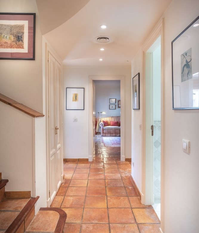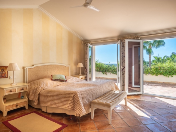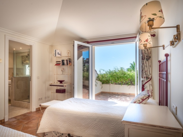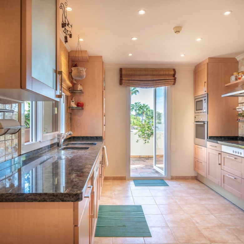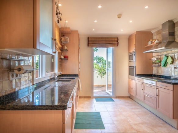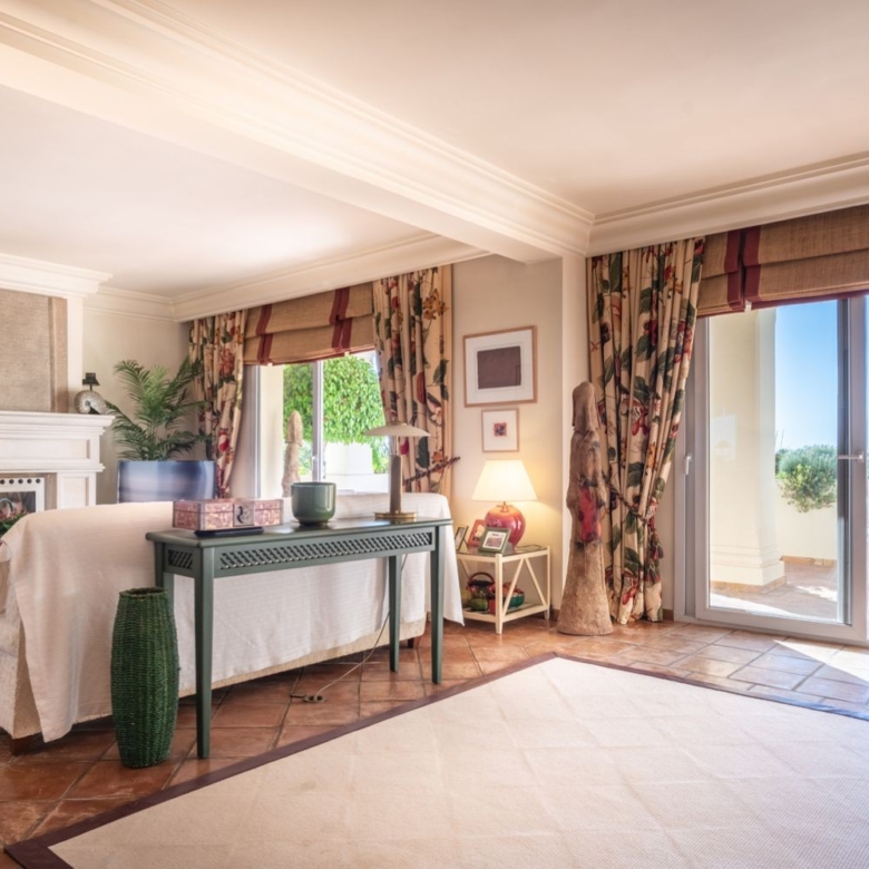 The spacious living and dining area opens onto a terrace that provides both sun and shade all day long, offering stunning views of the swimming pool, gardens, and La Concha mountain from the rear terrace.
