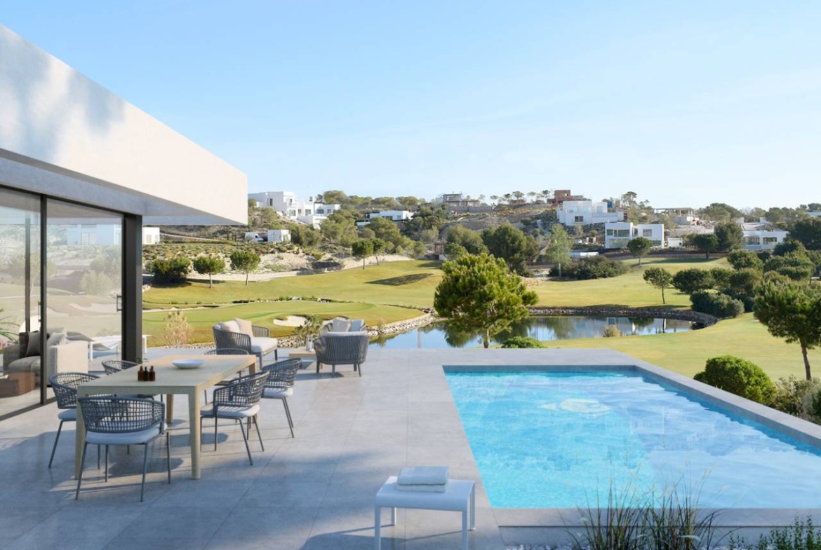 This new build luxury villa has great golf views over the golf course of the outstanding Las Colinas Golf & Country Club Resort. Finished to a high standard with three bedrooms and three bathrooms, a large open plan lounge/dining/kitchen area with patio doors leading out to the sun terrace and garden area with own private 7m x 3m swimming pool. Plot size 1,079 m2, with a build size of 300 m2 which includes a basement of 150 m2, garage, large sun terrace and garden.