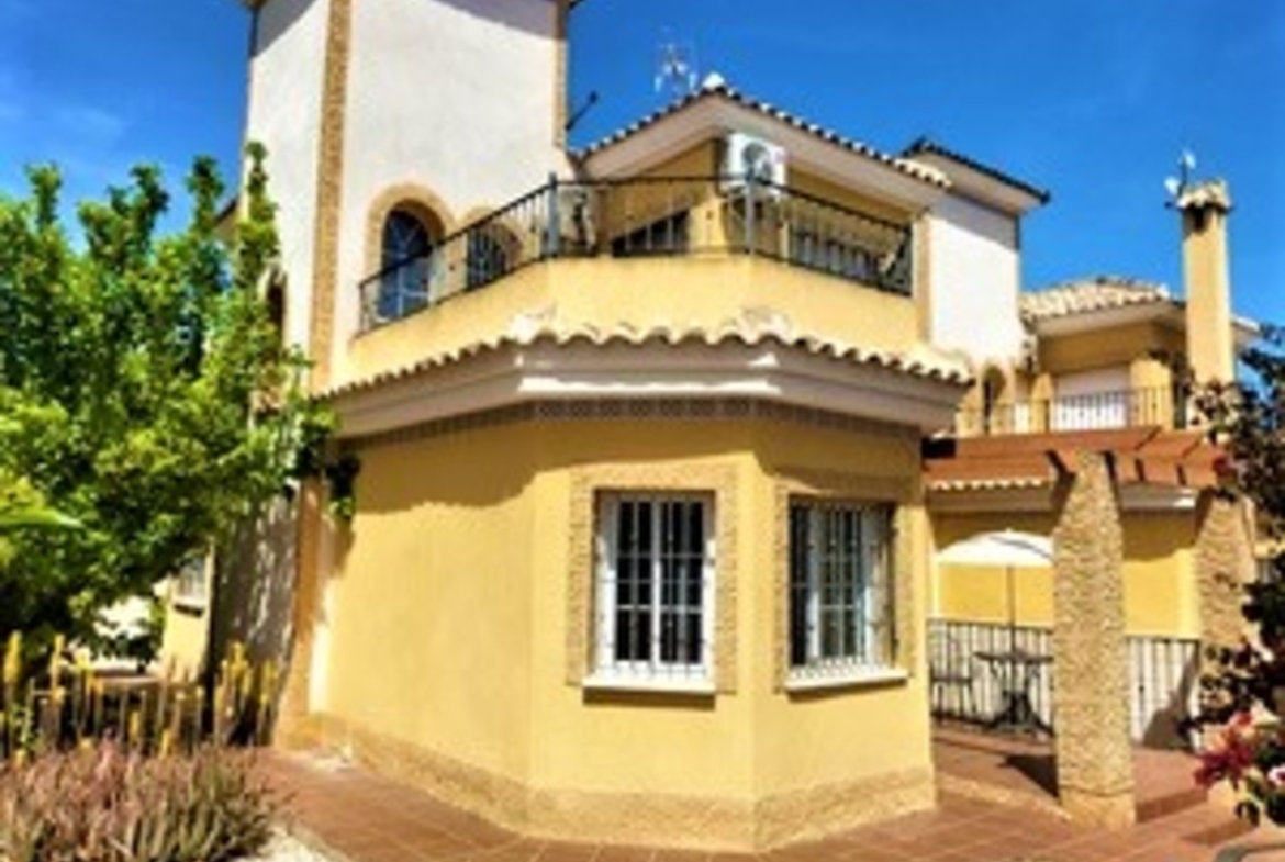 Beautiful SOUTH facing detached Villa in the lovely urbanizacion Lo Crispin next to Ciudad Quesada. The Villa has a 214m2 plot and 98m2 build. The Villas were build in 2010 and offers great living space. As we access the property there is a great outside space for sunbathing, off road parking and dining and even space to put a private pool. Entering the front door there is a large living room area and kitchen. There is 1 downstairs bedroom and bathroom. The second floor has another 2 large bedrooms and 1 bathroom , with one of the bedrooms has access to a good size balcony. The back garden area has a shed for storage. The Villa has gas centre heating throughout the property, Viewing highly recommended.