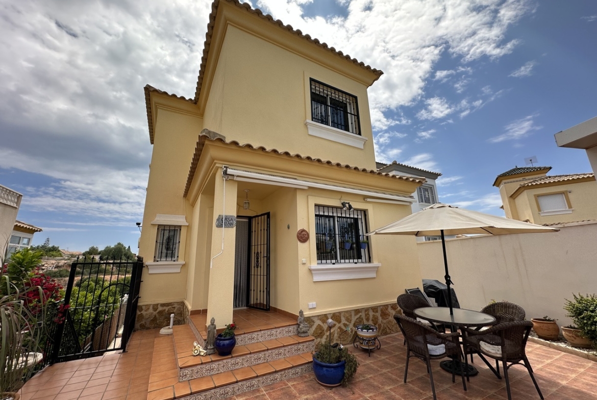 Immaculate and very well presented detached villa for sale in the sought after location Los Dolses, just a few minutes drive from Zenia Boulevard, Villamartin Plaza and La Zenia beach. This very spacious 4 bedroom, 3 bathroom property is built over three levels with a front and back garden, sunbathing deck overlooking the private swimming along with a glazed terrace and private solarium boasting green views over the ravine and out towards to the Mediterranean sea. On the ground level is a very bright living and dining room with galley style fully equipped kitchen and utility room. The glazed terrace is accessed via patio doors in the living room and overlooks the swimming pool. There is a double bedroom and family bathroom with walk-in shower. Upstairs is the master bedroom which has its own terrace, the family bathroom and an additional large bedroom. On the lower level of this villa is a second living/television room along with private access to the fourth bedroom with en-suite bathroom. This stunning bedroom has patio doors which lead outside to a private terrace overlooking the swimming pool and bbq area. This property has been maintained to a very high level and is sold fully furnished with many extras including central heating throughout, off-road parking, separate annex with own private entrance, the option to extend and add a fifth bedroom, retractable sun shades and car port. Viewing recommended.
